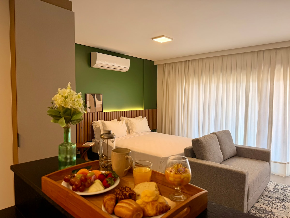 Relaxe neste espaço calmo e cheio de estilo. Este apartamento está localizado a poucos minutos das praias, restaurantes e shopping - ideal para casais ou viajantes individuais - 1 cama King - Cozinha equipada (micro-ondas, fogão, geladeira, cafeteira) - Ar-condicionado - lençóis inclusos - Estacionamento privado - Check-in flexível **Regras da casa:** - Não é permitido fumar dentro do apartamento - Respeitar o silêncio entre 22h e 8h