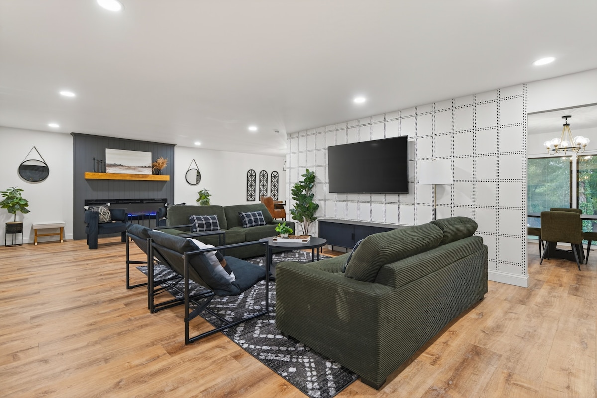 Newly finished basement with 4th bedroom (King bed), large play/relaxation space & large 120-inch projector screen and separate large speaker for movie nights! Beds are all brand new comfortable memory foam! This house is in such a great and convenient area! Freshly renovated with all brand new beds and furniture, a fully stocked kitchen for cooking and baking and a fenced in pet friendly backyard! TONS of kids and baby items!