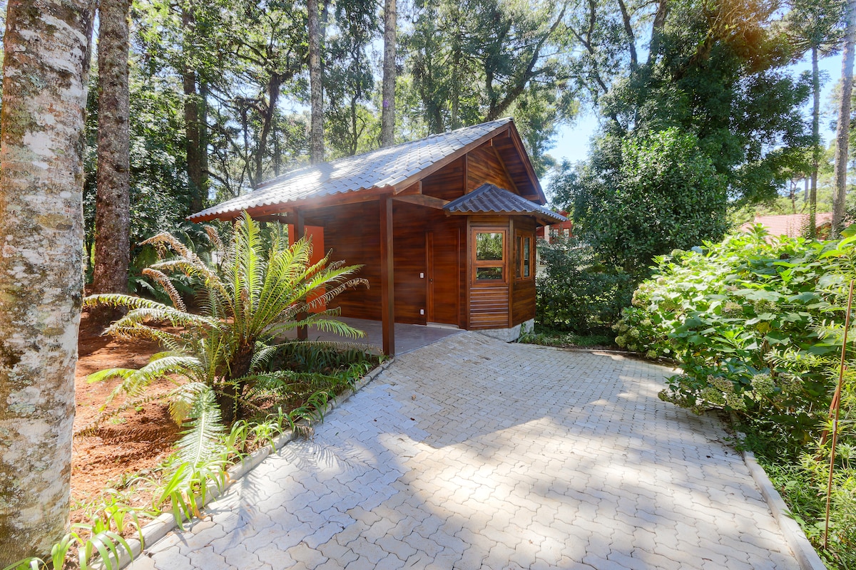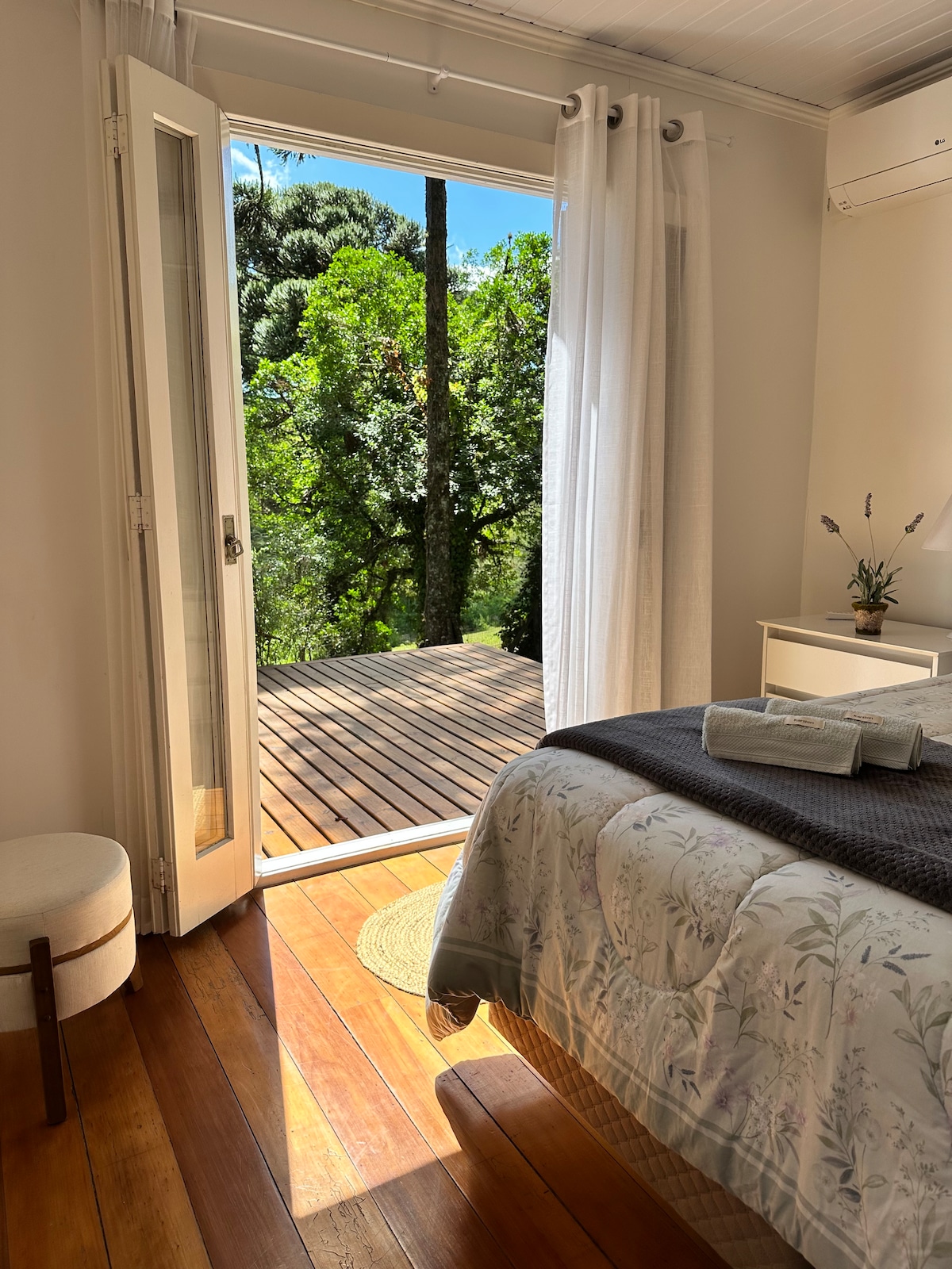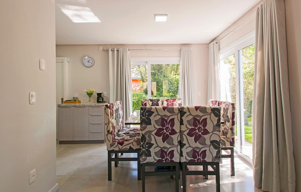 Casa de hóspedes com uma área privativa de 100m² localizada em um dos condomínios mais tradicionais de Canela. O espaço conta com ampla cozinha integrada com área de estar e jantar, 1 quarto e acomoda até 4 hóspedes. Também possui um jardim privativo com vista para o parque do condomínio. Além disso toda a casa possui energia gerada por painéis solares e captação de água da chuva como soluções eficientes e sustentáveis. Venha vivenciar a essência da serra gaúcha! @bossanovapropriedades