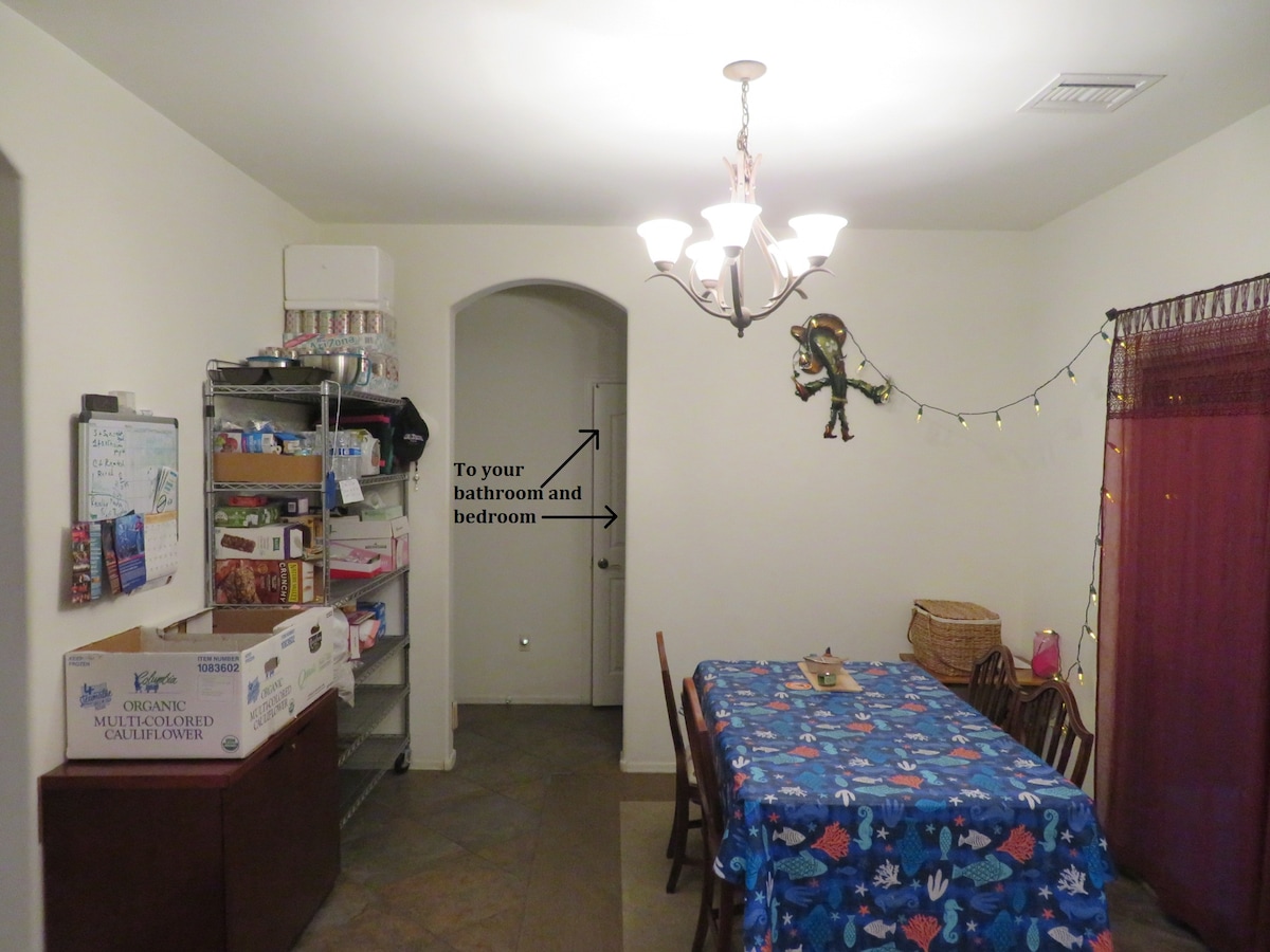 Family friendly (with ungated pool) 411sq ft Private Casita newly REMODELED! Sleeps up to 4. King feather bed & a pullout queen sleeper. Located just past a quaint garden where you can catch hummingbirds drinking. Private parking & entrance, just come and go. ASK ABOUT: Our other King Suite just feet away! Can sleep additional 2 guests! Cool off in pool, use outside patio (where cooking station is located, there's no kitchen in the casita). Min. from I-10 & stellar Tucson Biking Loop!!