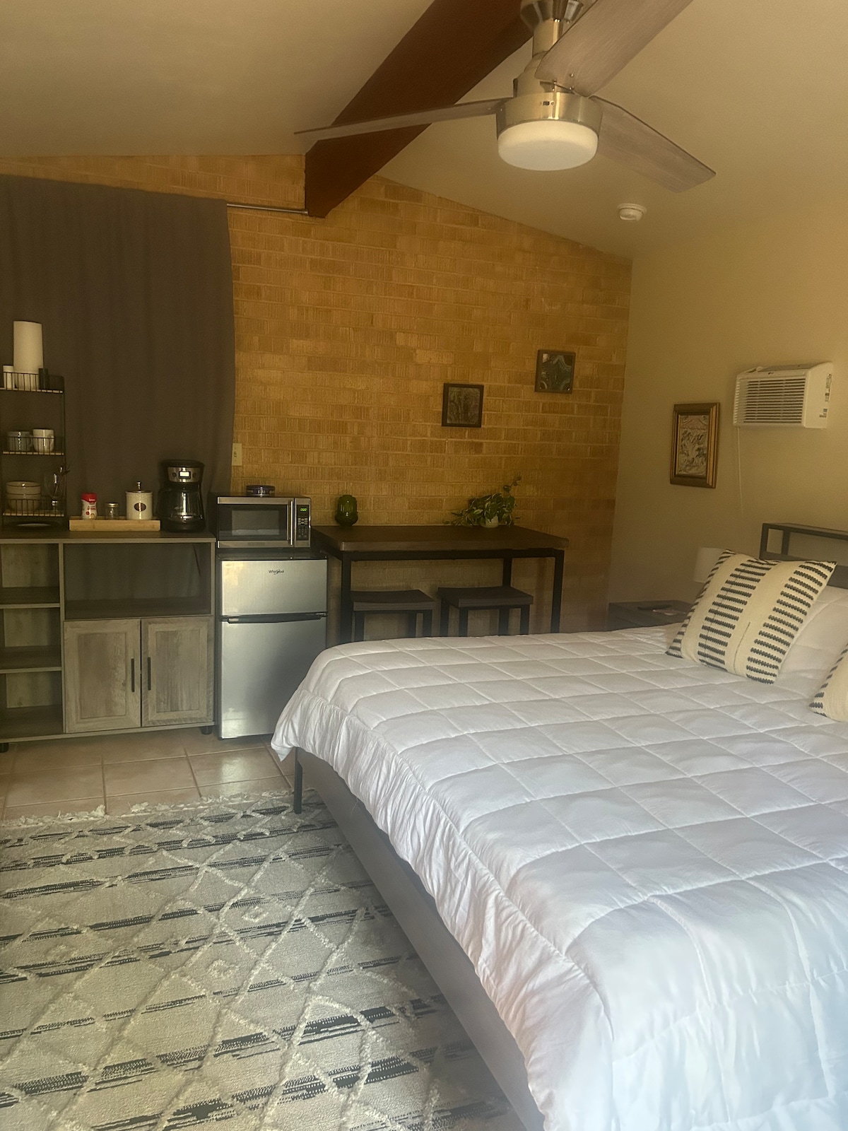 Cozy up in this remodeled studio on a beautiful 17-acre property in West Tucson Foothills. Part of an older 5-plex with 8 other houses, this charming unit features a king bed, common heating (kept around 70°F in winter), AC/heater mini split, small kitchen with microwave and stove/oven, Roku TV, and fast WiFi (~400 Mbps). ~350 sq ft of comfort with a beach-themed décor. Very clean, with lots of beach vibes—but no ocean. :) AZ TPT Lic 21337578