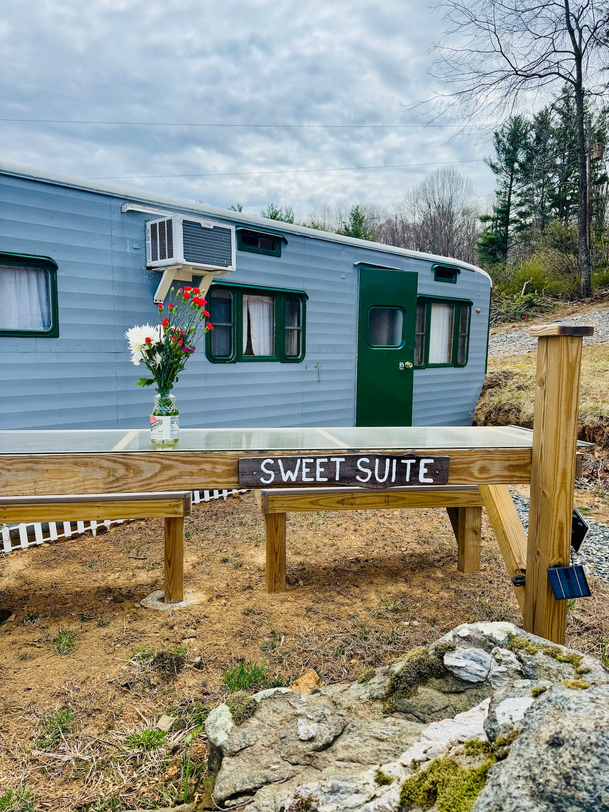 Sweet Suite is a 1955 Detroiter travel camper. Quite the exceptional camper for its day, Sweet Suite features 2 bedrooms, full bath and convertible sofa for another sleeping space. Sweet Suite has been refurbished with a lodge vibe and is a comfortable and charming way to spend your getaway!