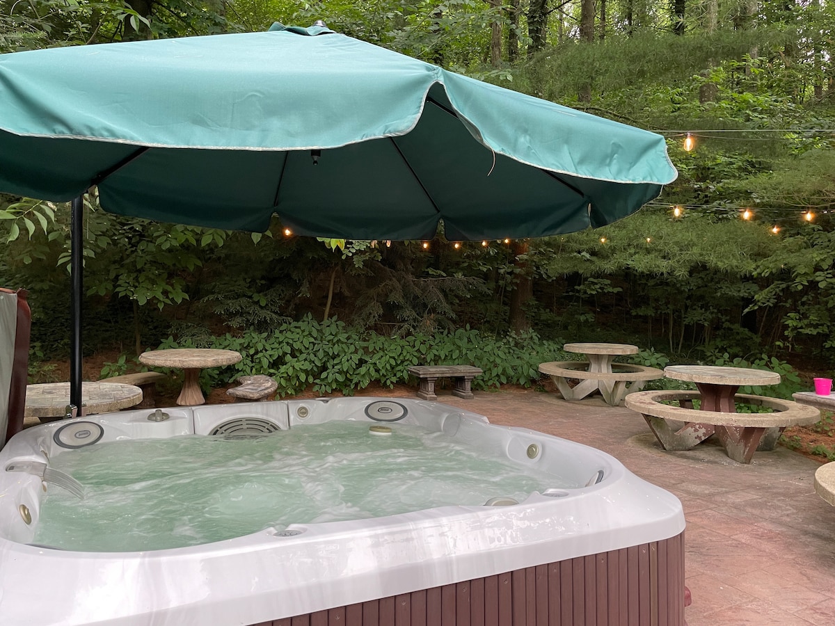 Retreat to the Fresno Escape! A private cabin featuring a year-round hot tub, perfect for relaxation. Tucked among pines and rocks in the heart of Amish country, where the occasional clip-clop of horse and buggies adds charm. Styled like a railroad depot, the artistically furnished home displays intricate stonework, tile and custom stained glass. The kitchen includes appliances and cookware, with the outdoor area offering a propane grill. Complimentary firewood is provided for the firepit.