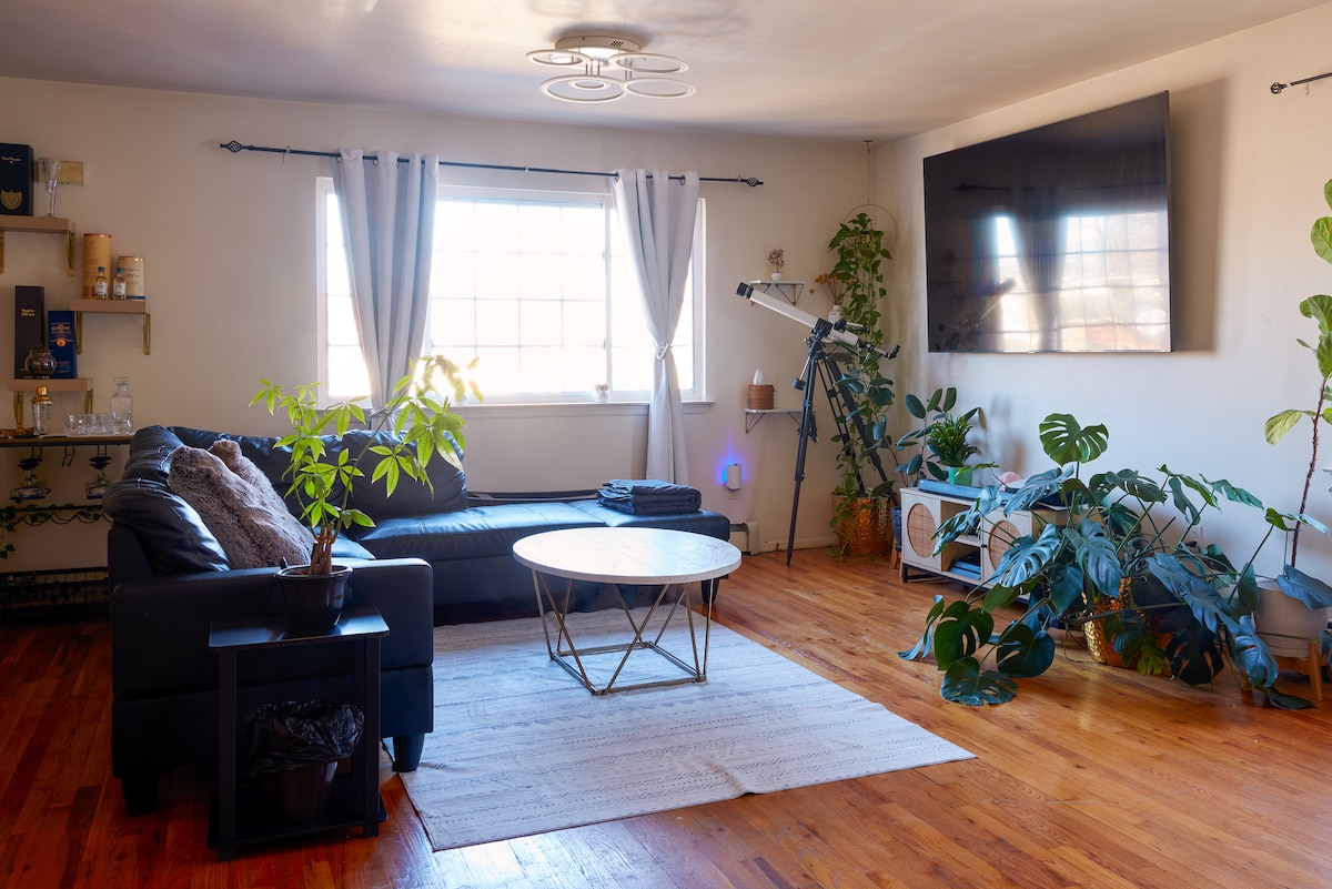 Private floor in a shared home. Romantic Moon Themed bedroom with balcony. This unique space offers a private bathroom and a private living room with a sofa bed. Perfect for the solo traveler or couples looking a QUIET romantic staycation. 1 bedroom will be fixed for 2 guests. Private kitchen on the first floor, and a hot tub for only two. Backyard and hot tub only until 9pm. Free street parking or driveway available. Please read the section “other details to note”.