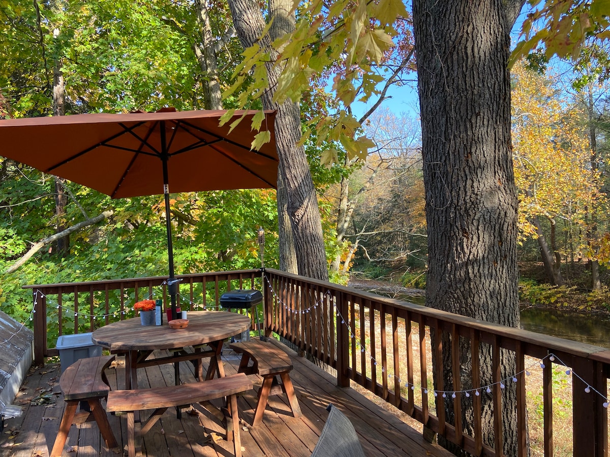 Beautiful 2 BR cottage on the water between pond & creek. Whole house with fully equipped kitchen, dining area, living room with fireplace, work areas with high speed internet, books, games, and ROKU TV. Primary bedroom faces the pond; 2nd bedroom is creekside. Outdoors include: gas firepit, picnic tables, gas grill, games, and seating by the water. This special get away is close to stores and Poconos seasonal activities, but tucked away for your relaxation and enjoyment.