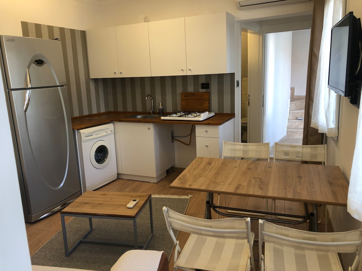 Bu şirin Taş Ev, Foça Merkez'de, plaja, tüm süpermarketlere, dükkanlara, kafe ve restaurantlara 5 dk. yürüme mesafesinde. 2 ayrı katta birer mutfak, banyo ve salon mevcut. Bir çift kişilik ve bir tek kişilik yatak odası var. Ön balkonda ve alt katın bahçesinde 6'şar kişilik yemek masası bulunuyor. Dilerseniz, özel dizayn edilmiş alanda OCAKBAŞI keyfi de yapabilirsiniz. Tüm mangal malzemeleri mevcut.