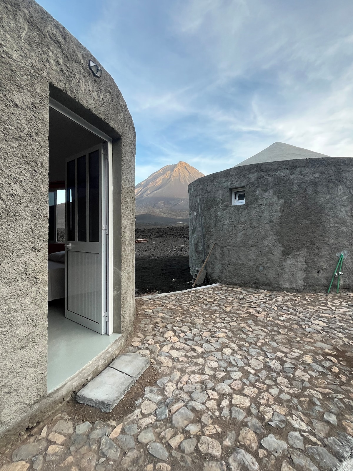 Your "Funku" is at the feet of the volcano Pico Do Fogo (2829) and next to the restaurant Casa Marisa. Funku's are unique traditional round-houses of Caldeiras, built with natural stone . and these are the only ones modified for guests. Inside comfy and with private bathroom, a staircase outside leading to the round and shadowed terrace overlooking the new lava-fields and the Pico. We are a family, and children (playground), couples of any kind, singles, pets and so on, are all welcome.