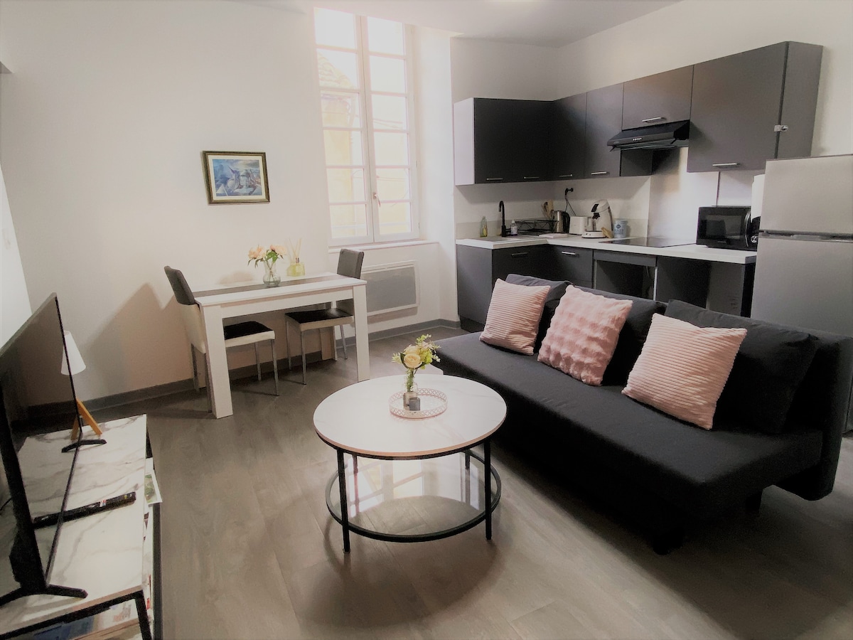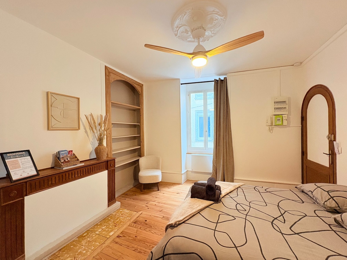 Charmant appartement de 75m2 en rez-de-chaussée, doté de 2 chambres spacieuses et un canapé convertible, il peut accueillir jusqu'à 5 personnes. L'appartement se caractérise par sa luminosité et son ambiance chaleureuse. Le parking est gratuit et se trouve à proximité de l'appartement. Situé à 5 min du centre-ville à pied, vous pourrez explorer nos attractions touristiques, et profiter pleinement de nos restaurants et boutiques du terroir.