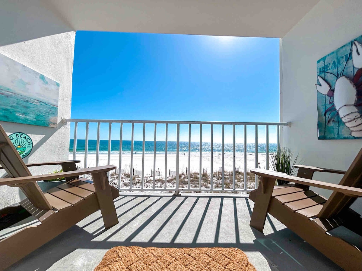 Enjoy incredible ocean views on our large covered patio from 4 bar height deck chairs at our spacious 2bedroom/2bath condo w/ a KING bed in BOTH master & 2nd bedroom, plus a sleeper sofa. Recharge, watch the waves, enjoy an uncrowded private beach. On 6th Floor in Plantation Palms bldg. in family-friendly Gulf Shores Plantation: outdoor and indoor pools, tennis/pickle ball courts, restaurants nearby. Includes beach service March - Oct. Ft Morgan is the best kept secret on the Gulf.
