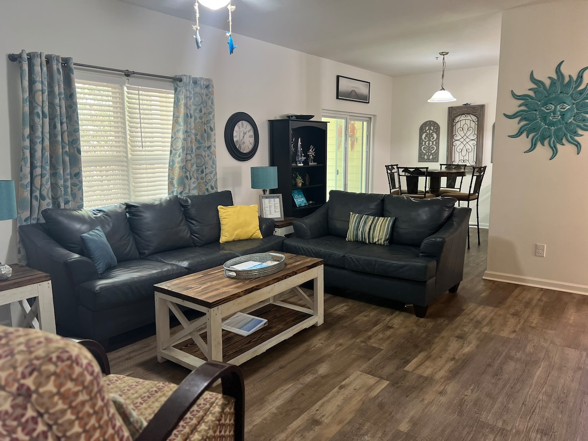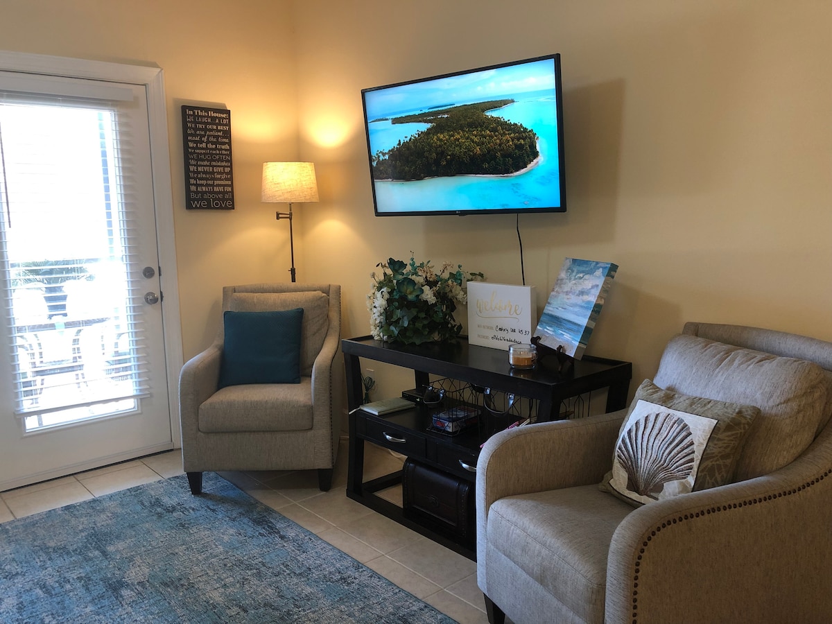 Relax with family at a peaceful, quite place. Beautiful 2 bedroom/2 private bathrooms, first floor condo at Dolphin Villas, within 1,5 miles from the beautiful beaches! It is spacious, appointed with plush furnishings and coastal decor. Bedroom 1: KING bed/Bedroom 2:QUEEN bed/Living room: Sectional sofa. WiFi, cable, washer, dryer, full kitchen are included. POLICIES: -ABSOLUTELY NO SMOKING IN THE UNIT! FINE IS MINIMUM $500 -No pets allowed -No parties and large gatherings FINE WILL APPLY