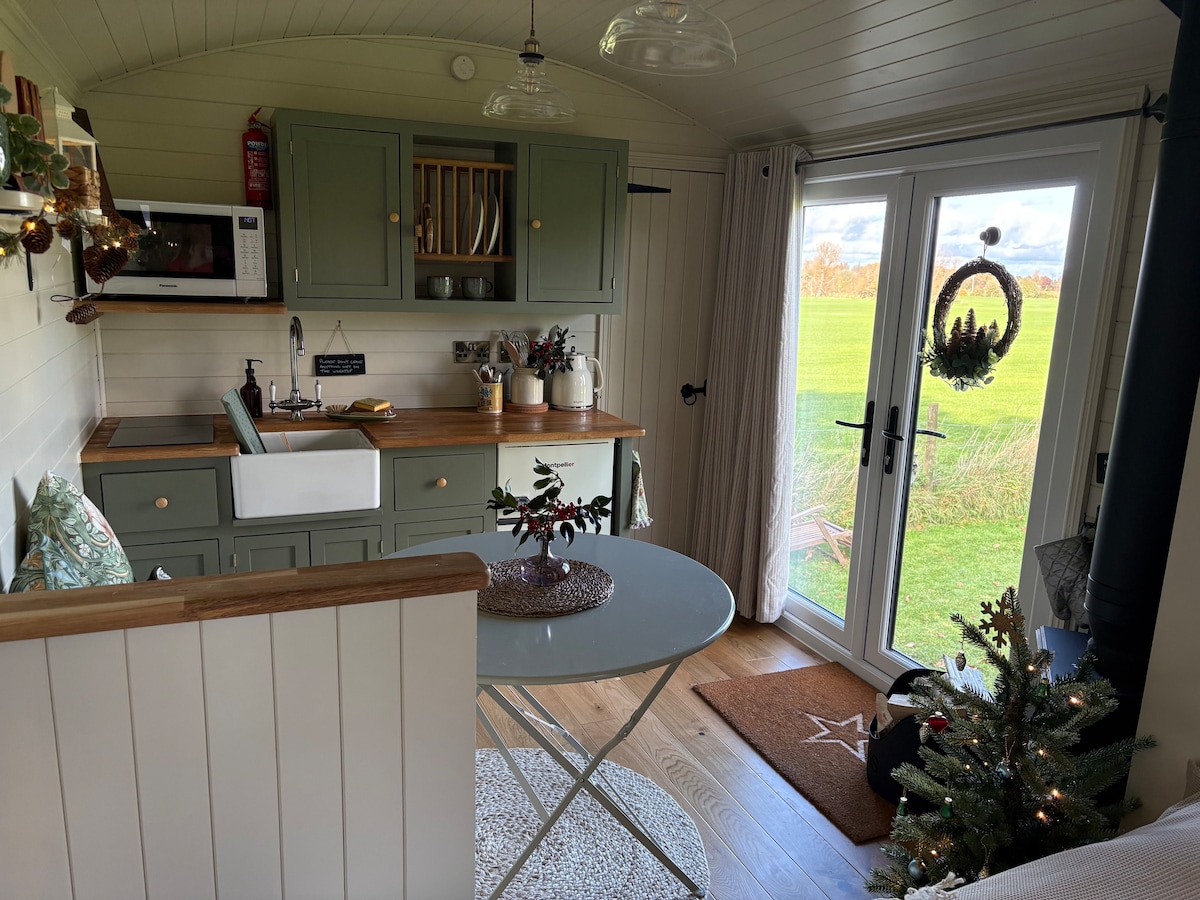 Come and stay at my lovely little shepherds hut 'Barrows Hut'. Located in a peaceful surrounding with undisturbed views. Enjoy the unique experience of spending the night in a shepherds hut but with the luxury of modern comforts. You can enjoy a full size walk in shower, comfy double bed and a kitchen. Enjoy and relax with a cup of tea or glass of bubbles outside on the patio or decked area in your own private garden with an option for a fire pit.