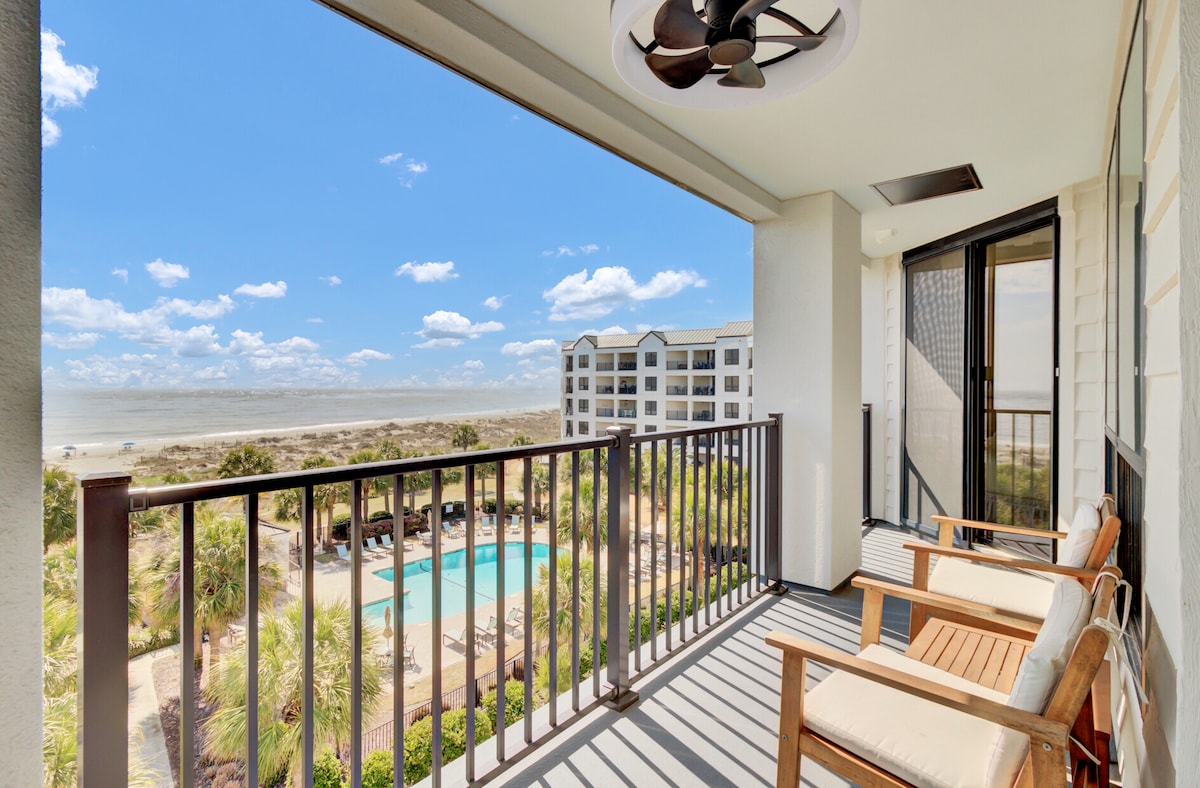 ROOF AND BUILDING MAINTENANCE ONGOING. THERE MAY BE WORKERS AND VEHICLES WEEKDAYS 7:30 AM - 6PM and SAT 9AM - 4PM. Beautiful, 1 B/1B unit with stunning views of the ocean and IOP beach. Enjoy your piece of paradise in this oceanfront unit with direct access to the beach, private pier, and pool. Relax with stunning views from the living room and balcony, just steps from the beach. Sleeps 5 (up to 4 adults & 1 child) with 1 Q bed, 1 Q sofa bed, and 1 hallway bunk.