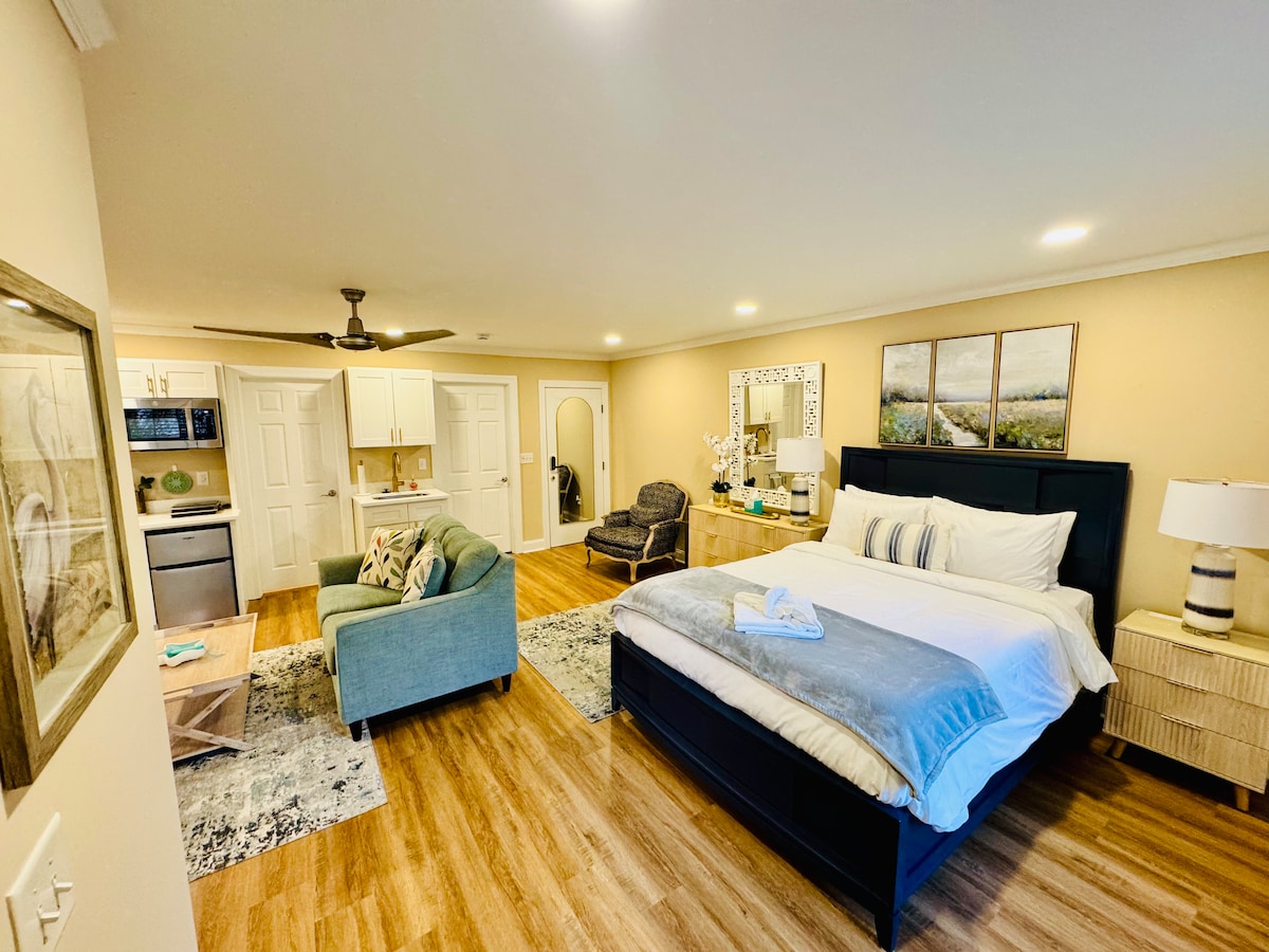 Our guest studio is located at our home minutes to Folly Beach and Downtown Charleston. The studio is one room and features a queen bed, dining area with an apartment size refrigerator, toaster oven and microwave. There is a bathroom with a small stand up shower. There is a private entrance, covered porch and fenced yard area along with off-street parking.