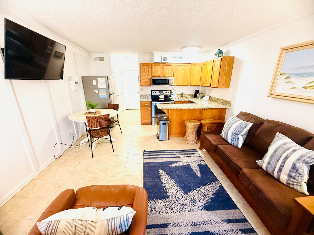1/2 block from beach🏝️ 1-bedroom, 1-bath private condo located in the heart of North Tybee Island. This popular beach getaway offers all the comforts of home, dog friendly, WiFi, 50" smart TV w/ cable, fully equipped kitchen w/ essentials, laundry room, and outdoor entrance. Less than a block from stores and restaurants, and 3 blocks from Tybee’s lighthouse. Basic essentials, beach supplies, and a grill are provided for your convenience. Free parking pass for 1 vehicle.