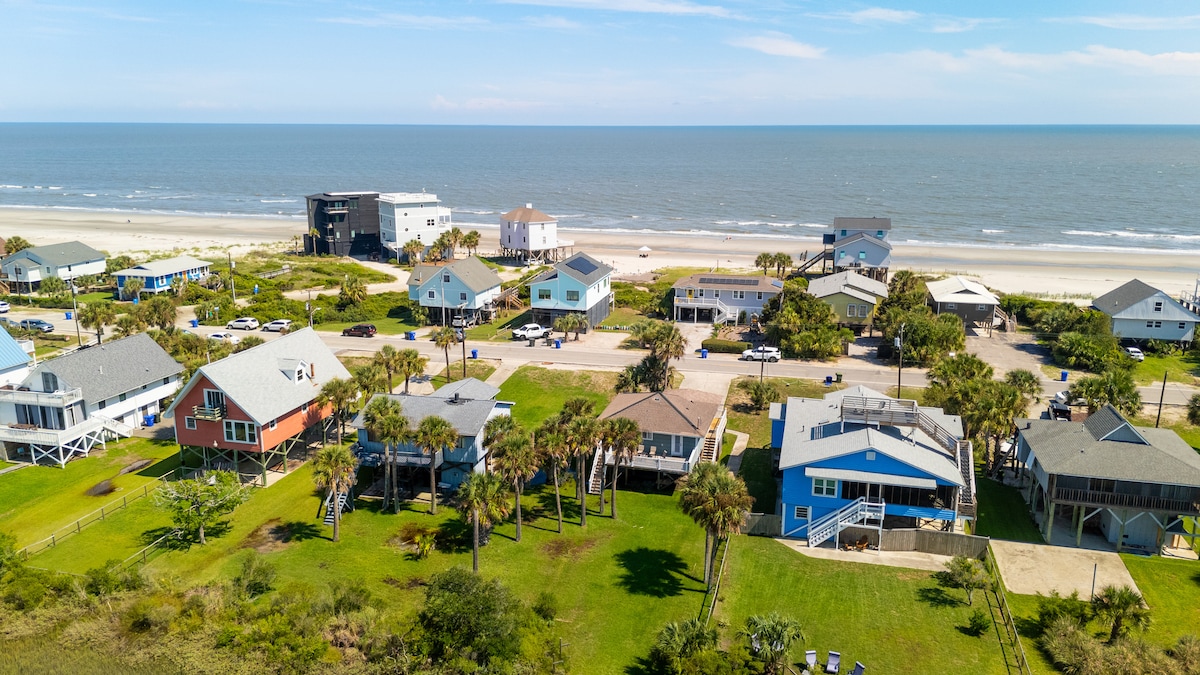 Location, location, location. Literally steps to the sand from this relaxing beach abode! Just roll out of bed and walk through the tree lined tunnel straight to the boardwalk of your own fairly private beach! Bring your dogs and let them roam the huge fenced in backyard lined with live oaks and a fire pit for the family to unite. A quieter part of Folly where the surfers like to shred but still only a short while to the bars of Folly and just 15 minutes from downtown. You will love this place!!