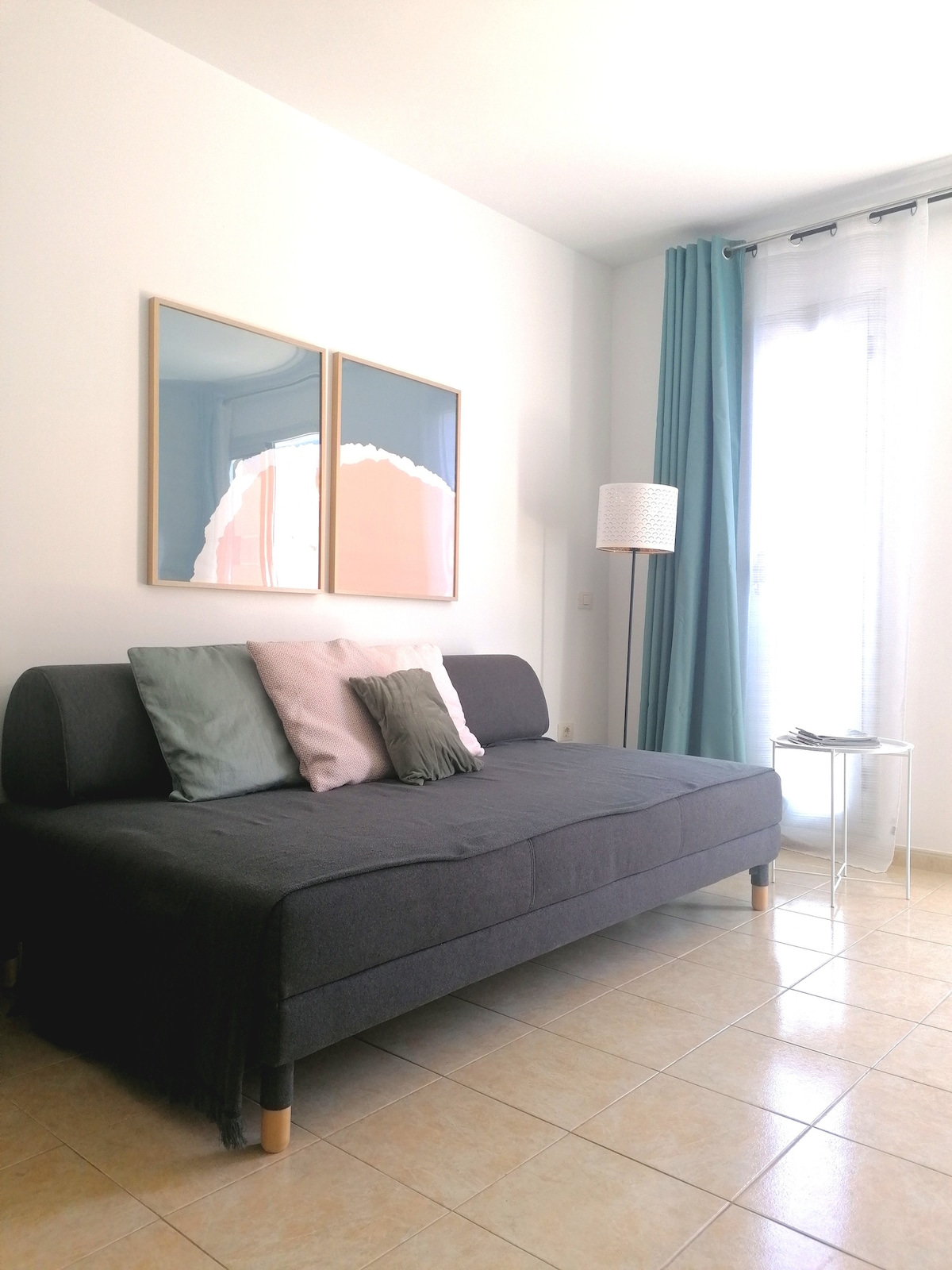 Enjoy a stylish experience at this centrally-located, 5 min to the beach place. Cozy, luxurious and quality furnished apartment can accommodate 3 or up to 4 persons (2 adults, 2 children). A double bed in the bedroom and a sofa in the living room. Terrace with morning sun for coffee. Kitchen with all the equipment you might need for cooking - oven, dishwasher. Air conditioner. Close to shops, bars, restaurants, playgrounds and bus stop
