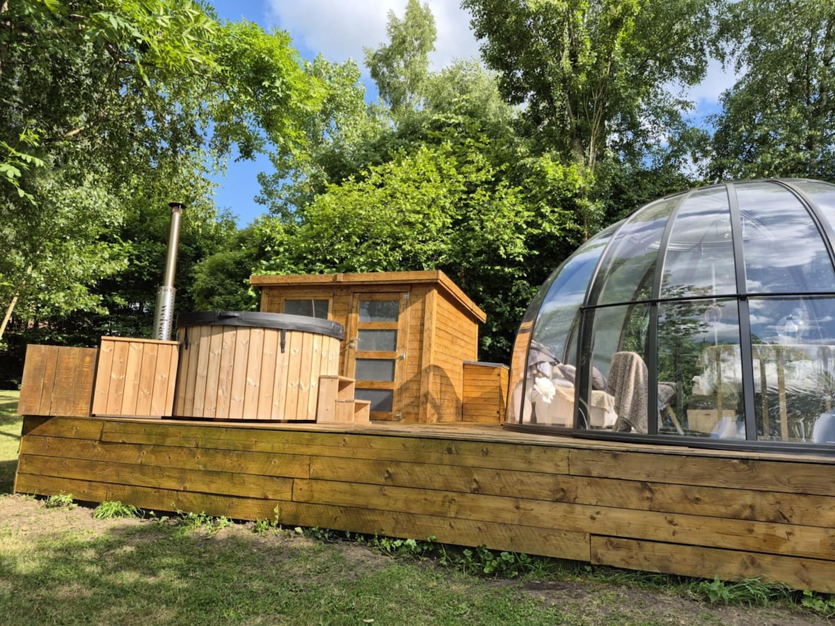 Domaine Des Foulons : Passer une nuit confortablement installé dans notre bulle HARMONIE prévue pour recevoir 2 à 4 personnes (lit 160x200 + canapé lit) ainsi qu'un poêle à pellets. Elle est équipée d’un chalet attenant, avec les commodités nécessaires (douche et toilettes sèches). A la belle étoile, vous profiterez de cette belle vue en étant douillettement installé dans votre lit ou en vous prélassant dans le bain suédois ! Les mots d’ordre sont sérénité, tranquillité et intimité totale !