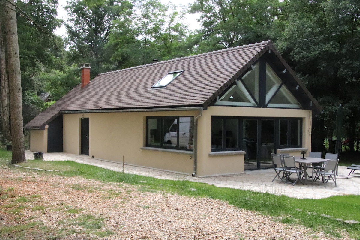 In the heart of the forest, independent 90 m² house on 4000 m² of enclosed land with terrace. Automatic gate, 2 bedrooms, one on the ground floor, large bright living room with fireplace and 160 cm sofa bed, fitted kitchen, bathroom with large shower. Complete equipment: dishwasher, washing machine, dryer, oven, microwave, coffee machine, 4 G, barbecue, deckchairs, TV, mountain bike... Very beautiful setting, nature stay near Forest of 3 gables, Fontainebleau and Milly. Ideal family ....