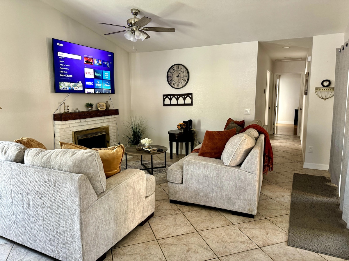 This beautiful remodeled home is located in a safe quiet cul-de-sac & has been tastefully furnished with all new furniture. It can comfortably host 8 guests with 4 bedrooms, dedicated work station, 1 Gig fiber optic internet, a well equipped & stocked kitchen, two comfortable lounge area, two 55inch TV, beautiful dinning area, fireplace, spacious outdoor dining, fire pit, gas grill for your outdoor cooking pleasure, well lit outdoor area, indoor laundry, central AC & heating & much more.
