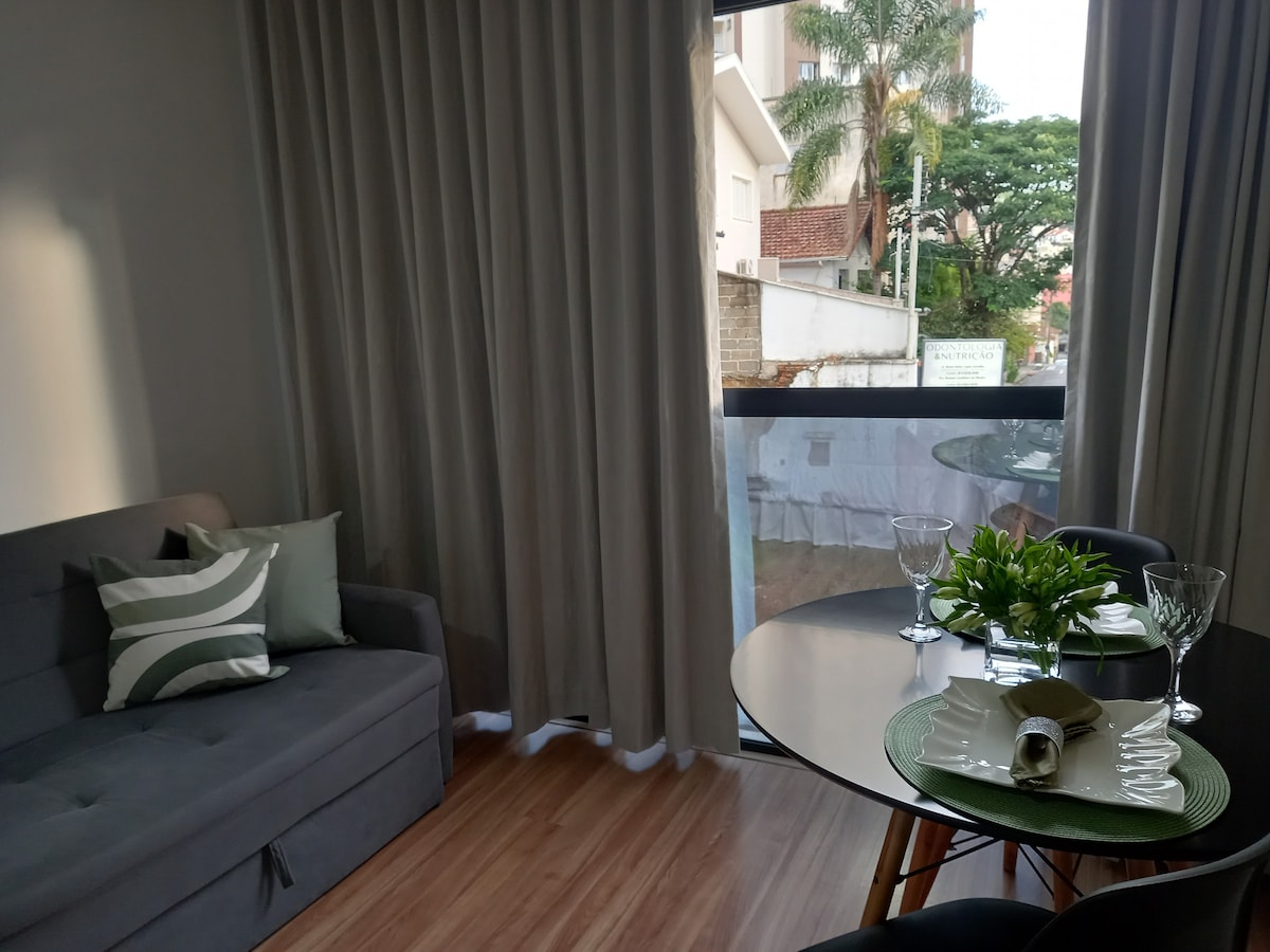 Obrigado por considerar nosso apto para sua estadia! Aqui, você terá todo o conforto e limpeza numa localização privilegiada no centro de Poços de Caldas. O apto é novo, possui internet de alta velocidade, cama de casal e um sofá cama, sendo assim capaz de acomodar até quatro adultos. Sob demanda, também temos disponível berço e cadeirão. O edifício possui sala de cinema, lavanderia, área gourmet, academia e uma vaga de garagem coberta por apto! Faremos da sua estadia uma experiência única!