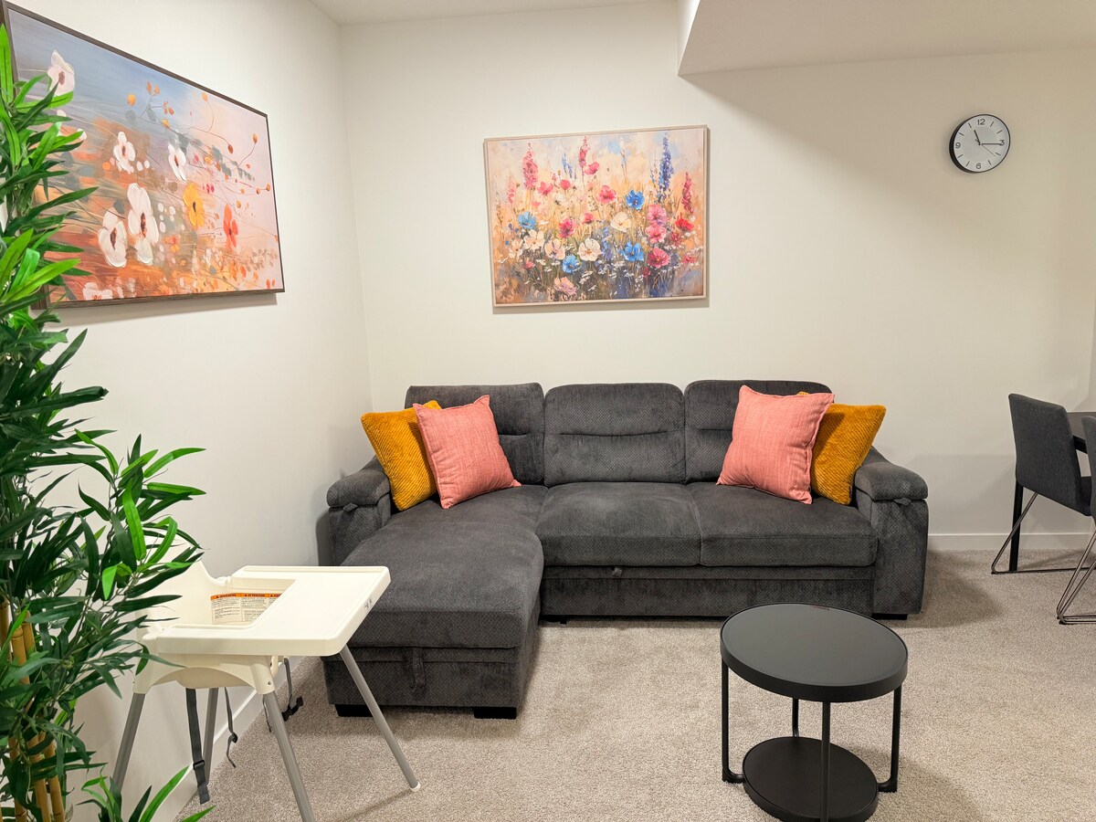 Retreat for couples or friends with fur babies allowed (per night per pet fee). Country town of Diamond Valley, gateway to Kananaskis. Basement suite with separate entrance below busy family home. Queen bed in bedroom & fold out queen in living area. 2 person hot tub room. 2 electric fireplaces. Bluetooth bathroom mirror. Heated bathroom floor. Steam shower. Wet bar & moveable island. Features local artwork, many for purchase. Add on products & services. Exterior & entrance security cameras