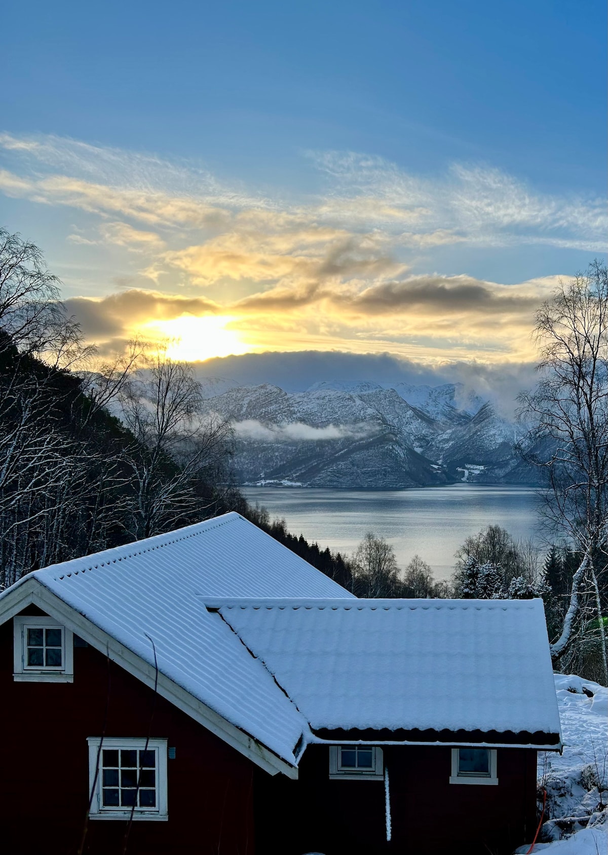 Our red Hytta at Sognefjord in Måren with, 🌊 Fjord views from the terrace, dining table & sofa 🔥 Private electric sauna & outdoor fireplace for cozy evenings 🏖 Sandy beach at the harbor & a waterfall, visible from the ferry 🥾 Hiking trails at your doorstep, with raspberries & Molte in summer ☕ Fully equipped kitchen with dishwasher & Bialetti espresso maker 🚿 Modern bathroom with shower & WC for comfort in nature ⛴ Easily accessible by ferry, parking at the hytta or harbor
