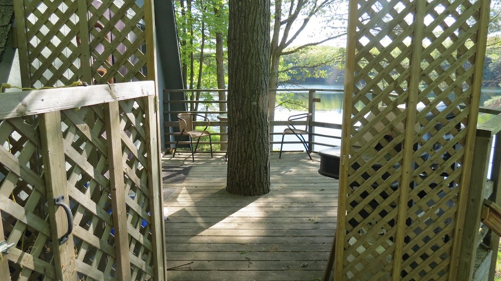 Cozy forest retreat perfect for a winter escape. Watch the snow fall through soaring windows and warm up by the wood stove. Enjoy a custom kitchen, heated floors, rain shower, claw foot tub, and a hot tub on the deck under the stars. The bright open layout features a pull-out king daybed and forest-view bedroom. Steps from the lake, 25 mins to Frontenac Park, 40 mins to Kingston—your peaceful nature getaway awaits.