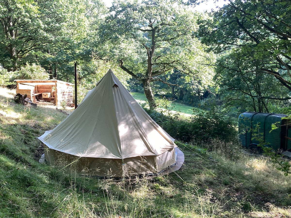 Enjoy your own secluded corner of the field on our small family run farm deep with in Herefordshire. The bell tent is nestled with in a group of maple trees, it is set off the ground and features a cosy interior a comfy king size bed with fresh bedding. You have your own private deck area complete with BBQ fire pit and seating.The bell tent is completely off grid so you can spend your day unwinding.You have your own modern bathroom just a short stroll across the field. No smocking No pets