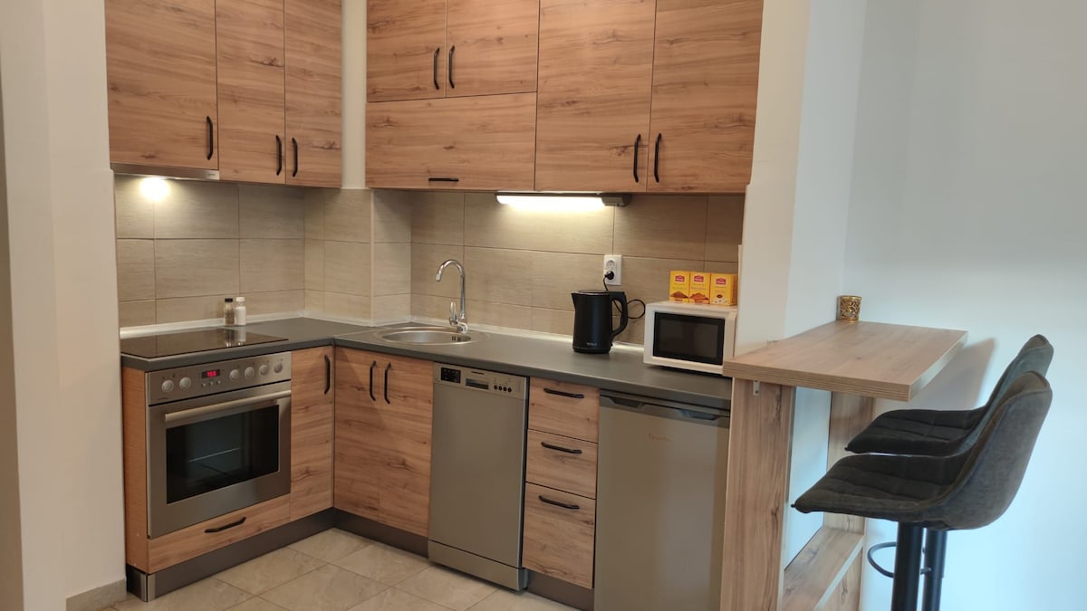 Relax in this spacious one bedroom apartment under the mountains of Sarajevo. It is located very near the airport and connected to the city center via quick routes and public transport. With a short 10 minute ride you can find yourself at the beautiful Trebevic mountain, as well as Bjelasnica and Igman. The living room is equipped with one extendable and one regular couch, suitable best for up to 3 guests. Enjoy your mornings on the relaxing balcony with a pleasent view.