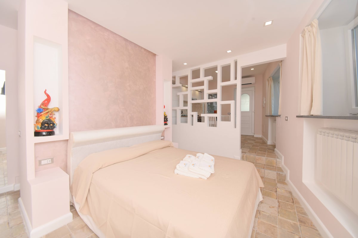 Newly refurbisced cozy apartment within a controlled traffic zone ,a minutes's walk from the sea.It has a wonderful view of the Aragonese Castle, the bay of Saint Anna and of Capri. The apartment has two bedrooms, two bathrooms, a kitchen/living room area and a laundry room. And it also has a spacius balcony wich surrounds the house and where you can have breakfast and sunbathe. It has all the mod cons: Wi-fi, tv, air condictioning, a fridge, and oven a washing
