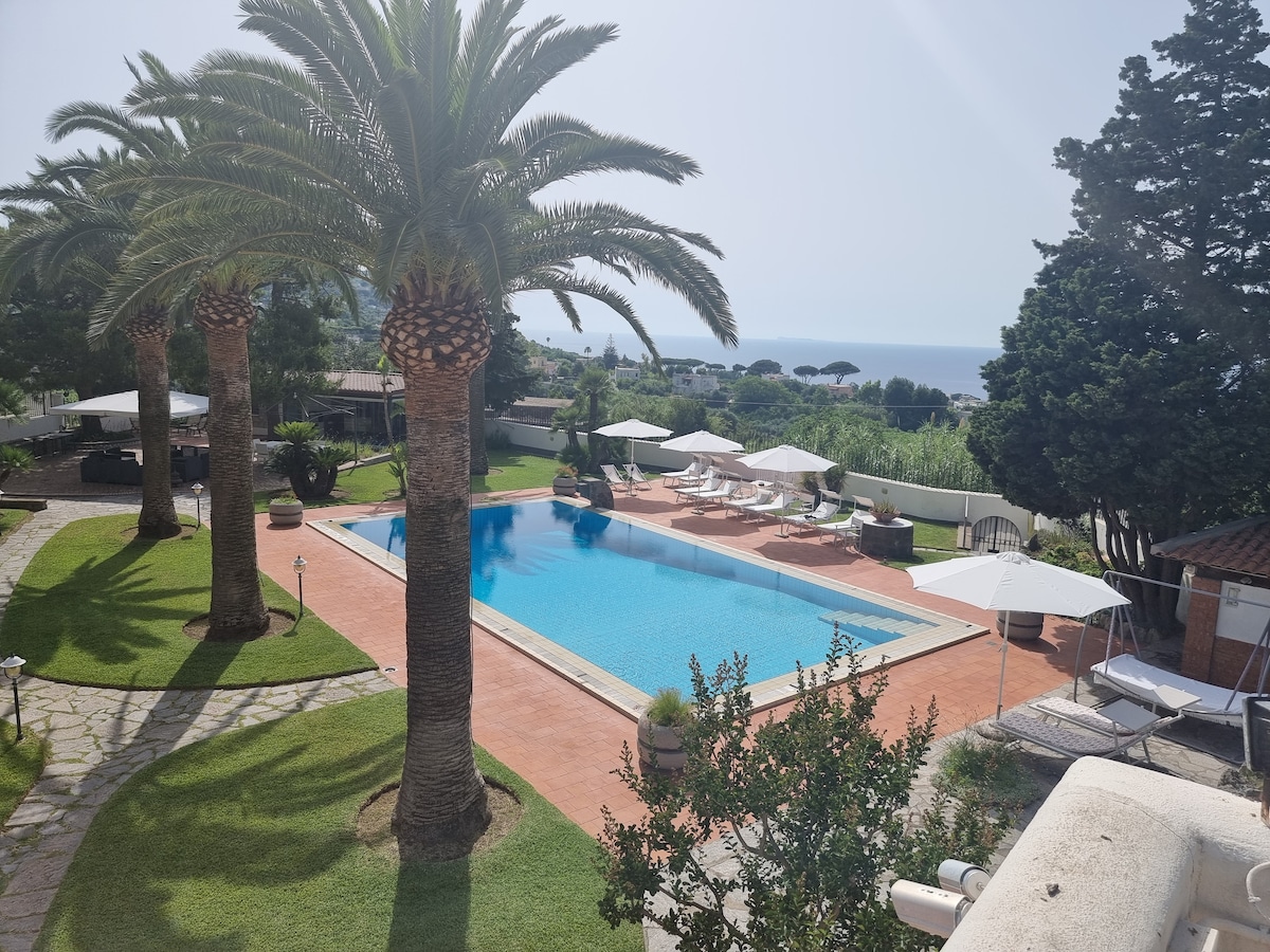 Una piscina termale, una sauna naturale. Una villa esclusiva immersa in un rigoglioso giardino, sospesa tra cielo e mare. Nell'incanto della Baia di Citara una delle più suggestive dell'isola perché esposta interamente ad Ovest: tramonti da sogno col sole rosso che si va spegnendo nel mare aperto dietro l'isola di Ventotene, unico ostacolo allo sguardo spalancato sull'orizzonte immenso. Sei camere da letto doppie, fresche, panoramiche ognuna con suo bagno, ventilatori e mini frigo.