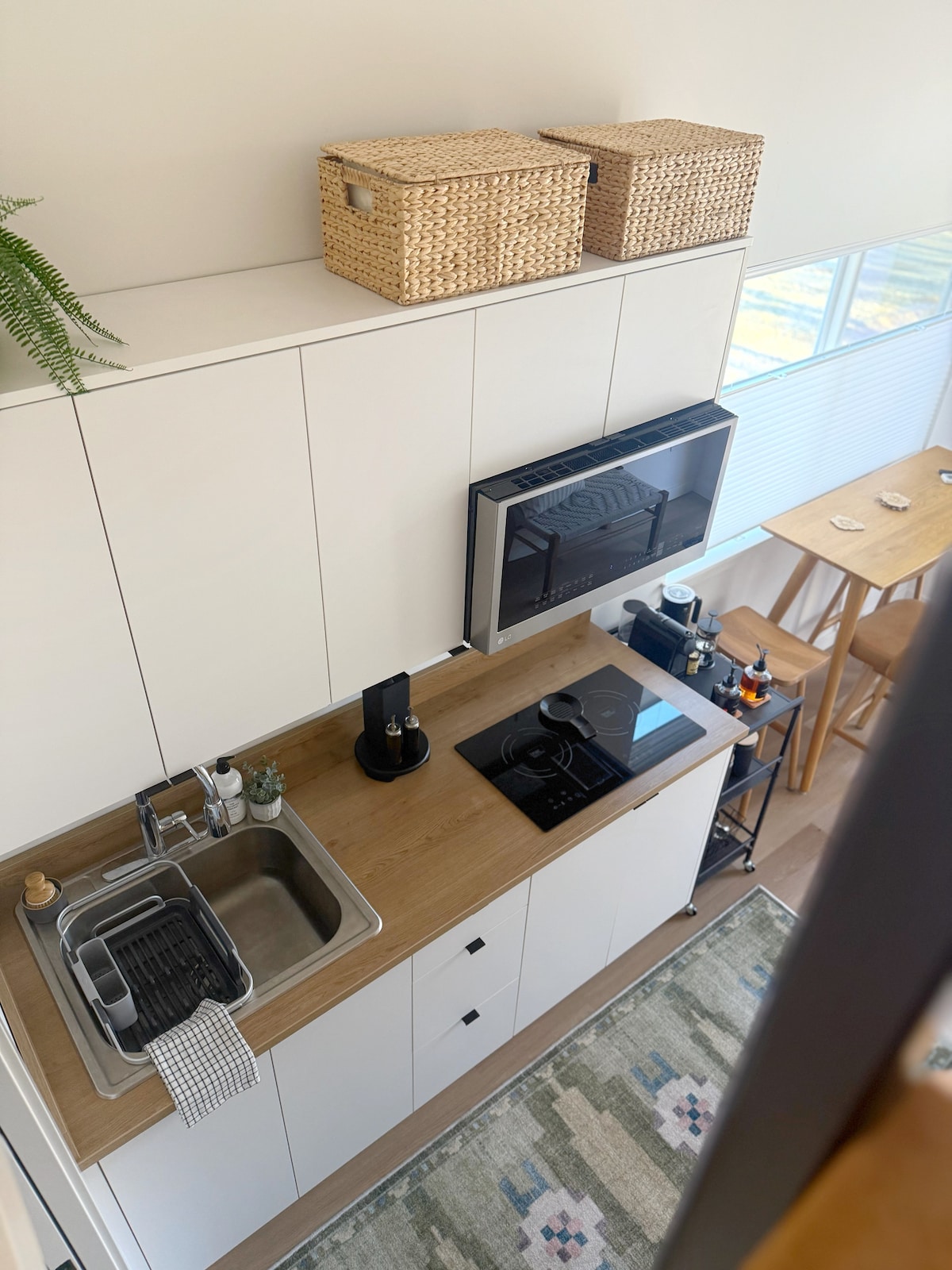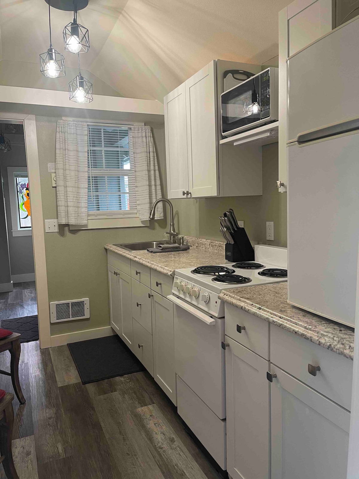 Welcome to The Rustic Retreat This rustic cabin housed a family of 5 the first 4 years of developing the property that we continue working on. This space has a fully functioning kitchen, one private bedroom,and a twin bed in the loft. The bathroom is a European style wet bath with plenty of space to shower. We are situated in a prime location minutes to town on 5 acres. The tiny house and main house are roughly 100 feet apart and surrounded by tall trees.