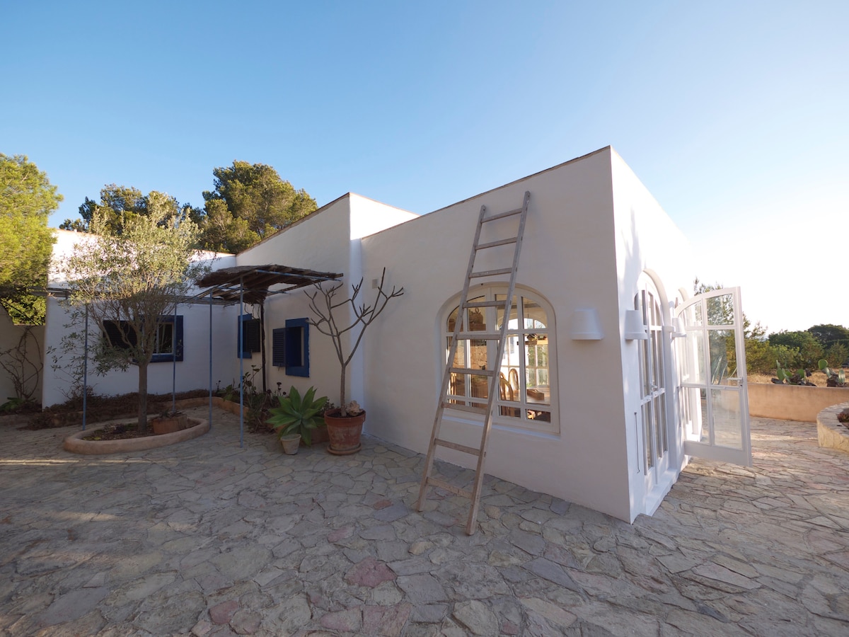 Very beautiful finca style house with lake and sea view and pool. Fully renovated. Situated in a quiet and protected area just a few minutes car or bike ride from the most beautiful beaches of the island and the best restaurants, bars and shops in La Savina, S. Francesc and in Espujols. 4 bedrooms and 3 bathrooms . A living and dining room with open kitchen and many outdoor spaces. Lots of terraces and exterior dining area. 180° lake and sea-view and to the east and the west.