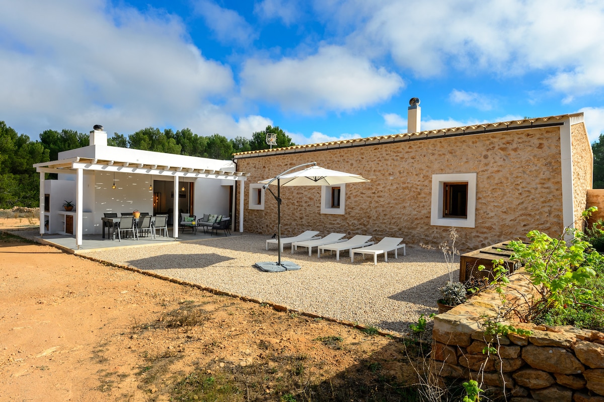 Very beautiful finca style house with lake and sea view and pool. Fully renovated. Situated in a quiet and protected area just a few minutes car or bike ride from the most beautiful beaches of the island and the best restaurants, bars and shops in La Savina, S. Francesc and in Espujols. 4 bedrooms and 3 bathrooms . A living and dining room with open kitchen and many outdoor spaces. Lots of terraces and exterior dining area. 180° lake and sea-view and to the east and the west.