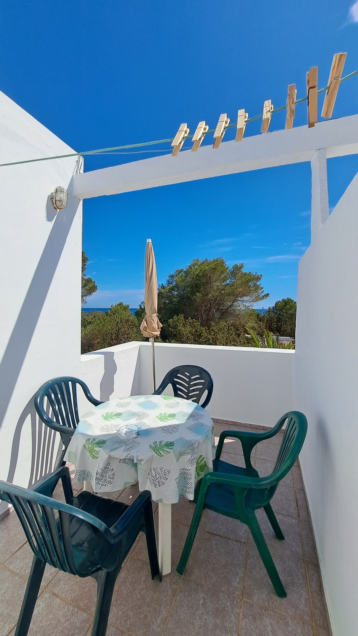 Appartement refait à neuf, tout confort. Situation idéale : dans une zone calme d'Es Pujols mais à proximité de tous les commerces et restaurants. La plage est à 200 mètres, 3 minutes à pied. Spacieux salon avec cuisine ouverte, terrasse avec vue sur la pinède et la mer. 2 chambres équipées de climatisation réversible, 1 salle de douche. Très confortable, bien décoré et équipé, idéal en été comme hors saison, en famille ou entre amis. Titulaire de la licence touristique.