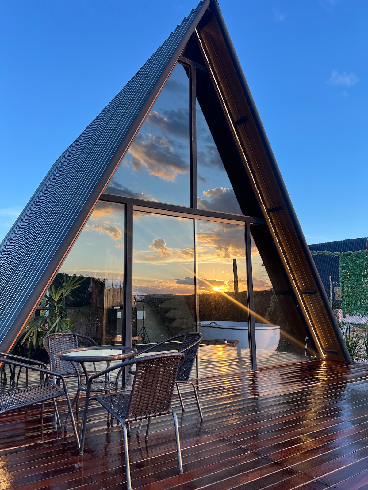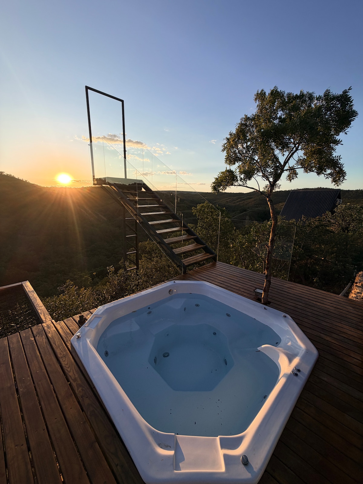 Nosso Bangalô tem uma Jacuzzi grande com aquecimento a gás para o período da noite e solar durante o dia (mantendo a água sempre quente) um pôr do sol incrível, cama com trilhos que sai para fora do quarto com um colchão queen super confortável com molas ensacadas , um banheiro rústico lindo com torneira e chuveiro que sai do teto, projetor de cinema e uma cozinha em formato de ilha de frente para a vista das montanhas. Tudo isso bem pertinho da cidade a 2 km de estrada de chão.