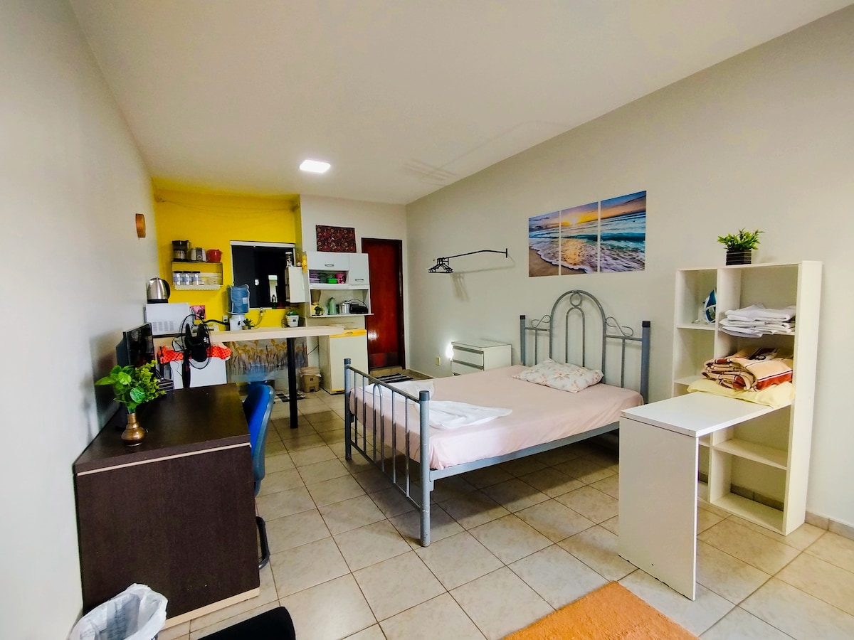 O Flat é aquele espaço preferido de quem busca conforto, praticidade e tranquilidade. Pequeno, mas confortável. No coração de Formosa. Localizado no cruzamento das principais ruas do centro da cidade. Perto de tudo. Pra quem fica aqui: restaurantes, mercados, lojas, padarias e muitas lojas à um passo. O estacionamento é na esquina, particular, bem em conta, ou na rua, local tranquilo a noite. Acomoda casal e solteiro (colchão extra.) Vai passar uma temporada? vamos combinar. Reserve já.