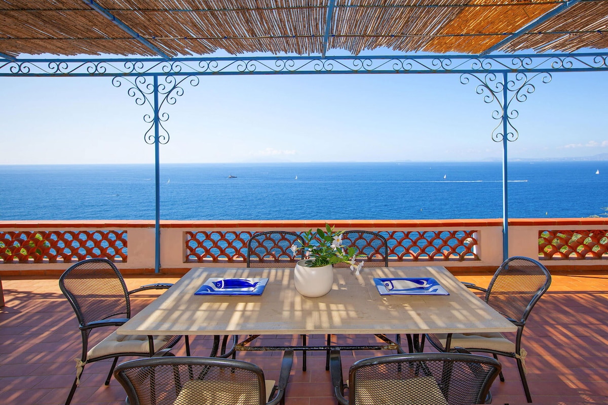 Experience the Amalfi atmosphere by staying in a villa with stucco, vaulted ceilings, and artistic ceramics in shades of blue, overlooking the sea. Enjoy the view from the terrace with a pergola and garden kitchen. The villa offers two bright bedrooms, a convertible living room, kitchen, two bathrooms, veranda, balconies, terraces, solarium, garden with jacuzzi, pool, and barbecue. Exclusive access for guests. Reachable by descending 72 stone steps.