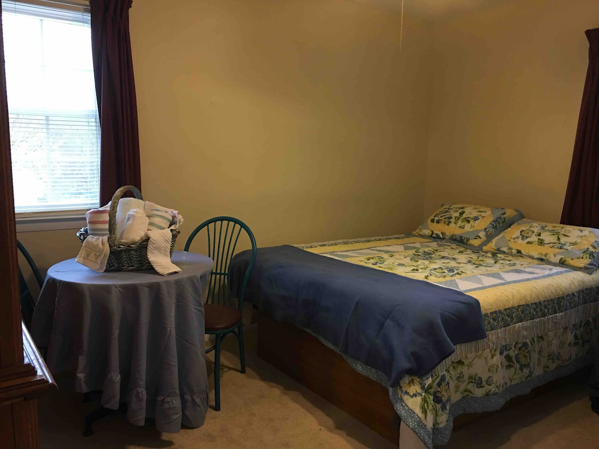 Come relax at the Deacon Den... Wake Forest a stone's throw away. You have access to the whole bottom floor of a quaint house in a great location with your own private entrance. This space boasts its own work out room with an inversion table, bike, and when available, a certified yoga instructor to stretch your imagination. Small kitchenette with full size fridge, washer/dryer, toaster, coffee maker. Hot tub outside your back door and large backyard with fire pit, grille and ambience.
