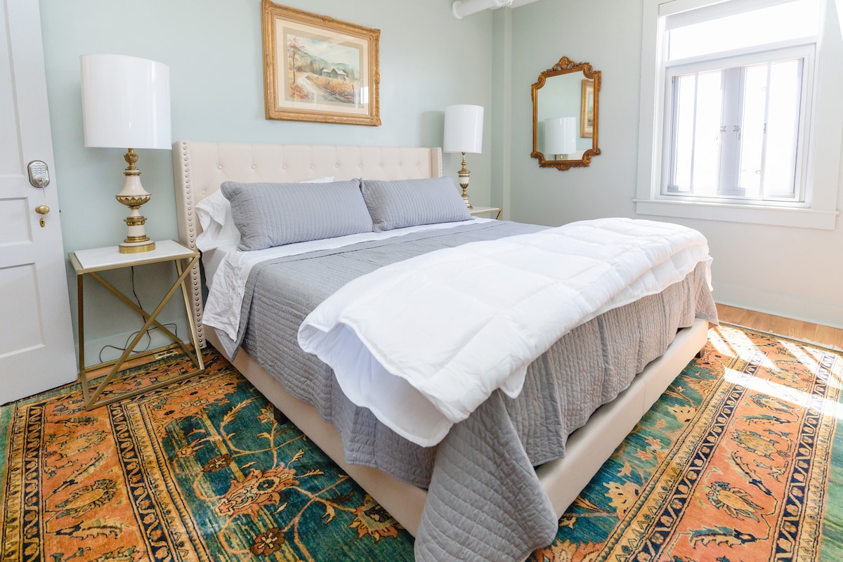 Refinement and comfort blend seamlessly in The Stoddard Room at The Huntley House. In this second-floor room, an interesting selection of timeless pieces, including a spacious British Colonial style king bed, combine with a soothing palette to help make your stay as relaxing as it is memorable. You’ll enjoy free WiFi and shared access to a sitting room with a coffee maker, laundry, mini-fridge and microwave. We have five dedicated parking spaces next door and ample un-metered street parking.