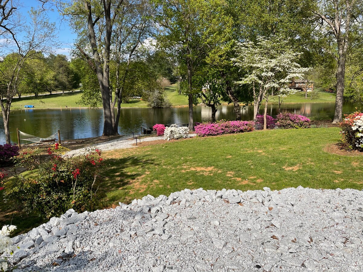 *Please read full description about the space - this suite is fully private but also the lower level of our home.* Cozy brick ranch with newly renovated, spacious lower level with a pond view. This private guest suite includes one bedroom with full bath, washer and dryer, living room with a pull out sofa bed, TV, kitchenette, dining area, reading area, small playroom for littles and an office space. Less than 20 min. drive to Baptist Hospital and Dtwn Winston, 25 min. to HP and 30 min. to GSO.
