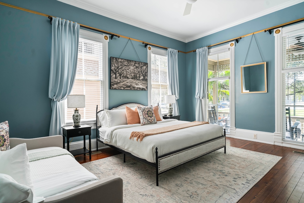 Book this place if you really want it ALL! Clean lines & modern updates, along with DROOL-WORTHY, 100+ year-old, heart pine floors & exposed brick fireplaces. Our 1887 Victorian has been lovingly restored & infused with vibrant local art, haint blue-green ceilings, and a fun sense of style that helps even the weariest travelers get excited about exploring our AMAZING city. This INCREDIBLE upstairs haven is a stone's throw from FAB Forsyth Park in the heart of the Victorian district. SVR-01068
