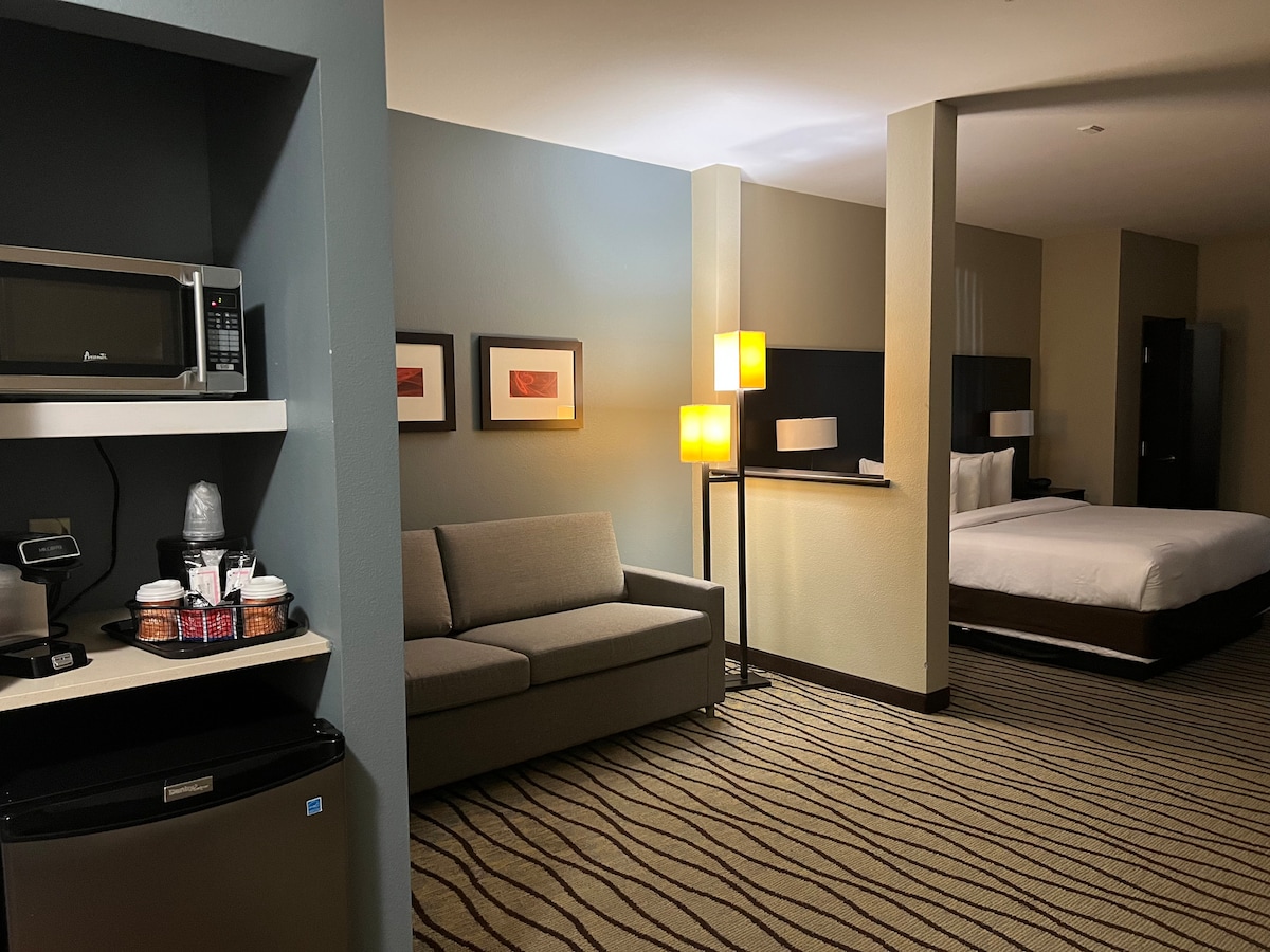 Relax in our One Bedroom King Suite, featuring a separate living area and a luxurious king-size bed for ultimate privacy and comfort. Elegant furnishings and modern amenities provide ample space to unwind or entertain, perfect for extended stays or special getaways. Enjoy a restful night’s sleep and all the comforts of home in a refined, welcoming setting.
