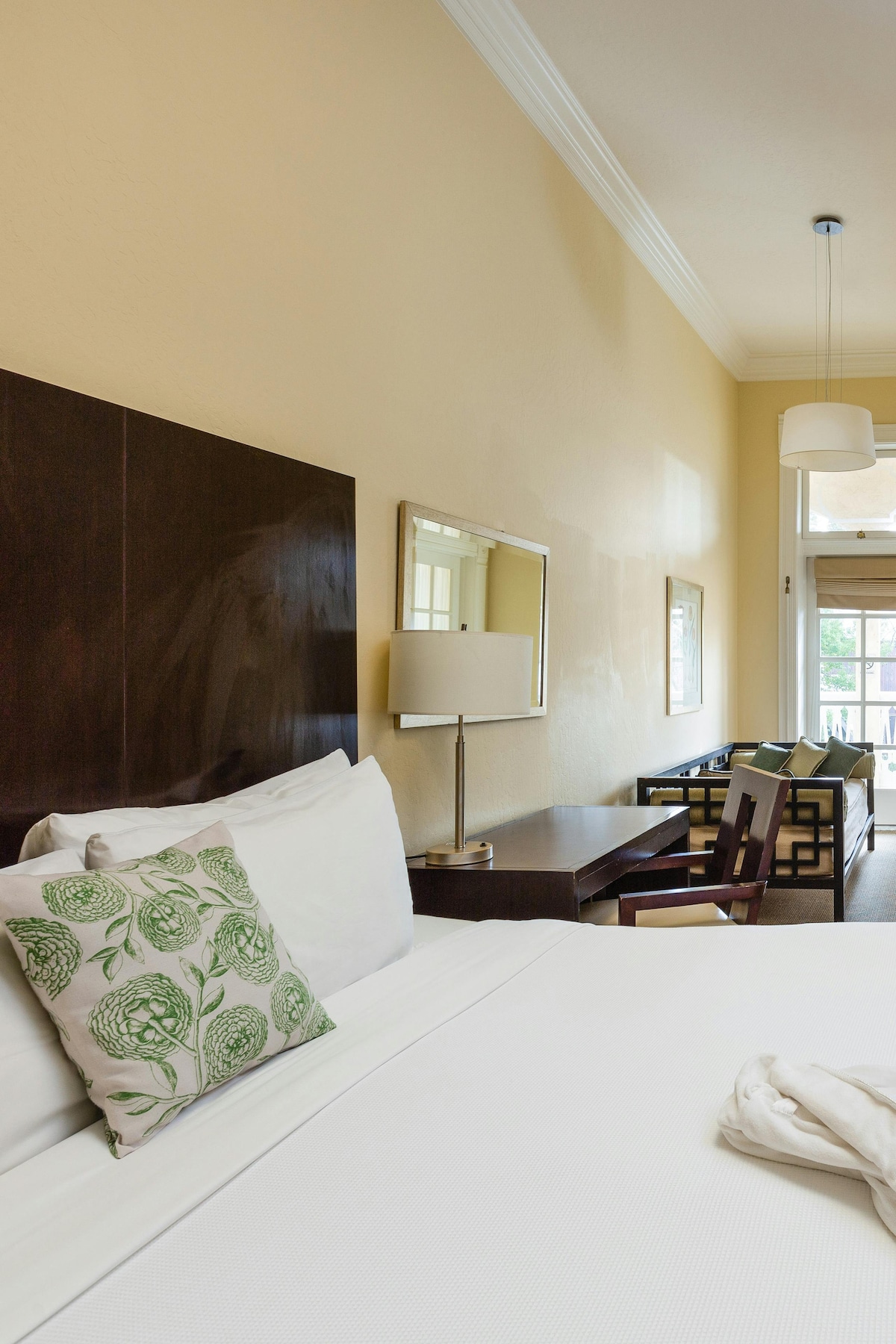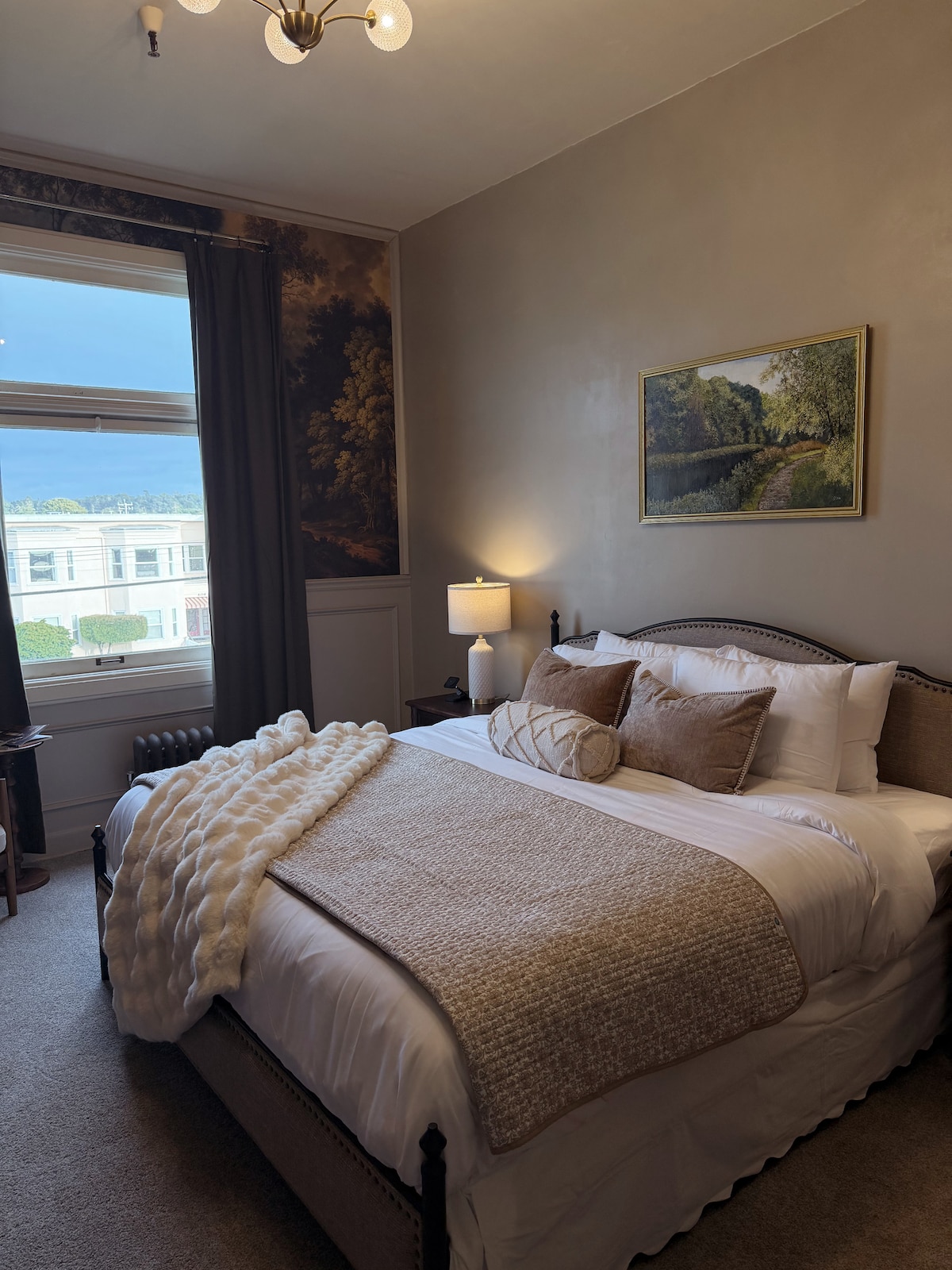 Welcome to The Pacific Grove at The Grey Whale Inn - a serene retreat where rugged coast meets misty forest. A King bed with premium linens, a tranquil evergreen mural, and views of historic Main Street set the scene. You may even spot the Skunk Train passing by. Enjoy in-room coffee, a beautifully updated bath, and walkable access to Glass Beach, shops, and galleries. Once a hospital room, this airy space honors its past - including the original nurse call light still tucked inside.