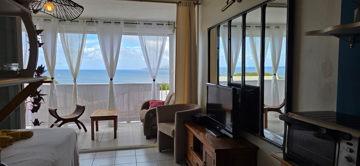 Turtle Bay Locations Grande Anse - Martinique Mini Villa T1 en hauteur offrant une vue panoramique sur la mer et la campagne. Accès mer à 50m à pieds. Plage connue pour ses nombreuses tortues vertes visibles en palme masque tubas toute l’année. Composée d’une chambre climatisée avec moustiquaire, une salle de douche avec WC, une cuisine équipée sur la terrasse couverte et une piscine privée de 2m*3m sur la terrasse découverte. Restaurant TiSable à 50m et petits commerces à 500m.