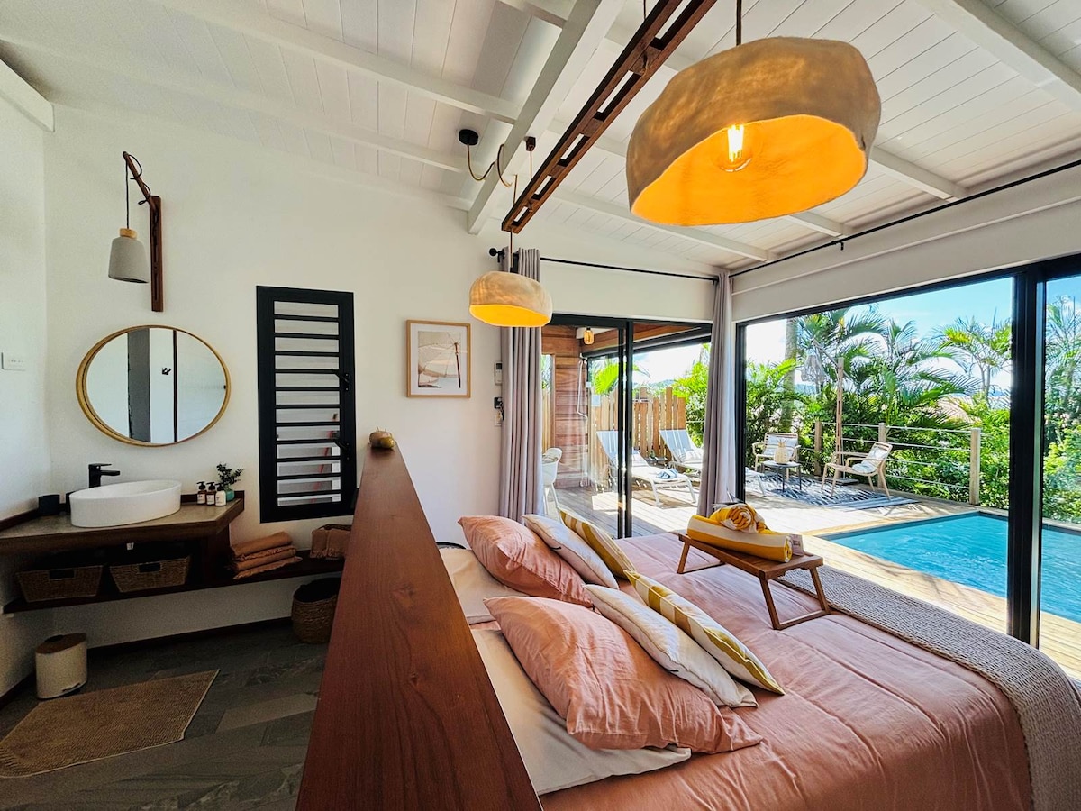 Le Ti Palmier Rouge was designed for lovers. Built in the middle of an orchard opposite the islets of Le François, this 40m2 space is dedicated to peace and love. Coconut, guava, acerola, avocado, mango and carambola trees surround the wooden chalet. The kitchenette is on the terrace, so you can make the most of the view. The 2x2m outside pool is made of river stone and has a unique feel. The beautifully decorated bedroom is air-conditioned. Italian shower, mini dressing room, kitchen outside..
