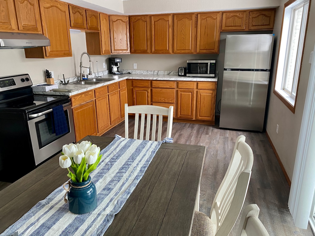 Come relax with your family in this peaceful and stylish 3 bedroom home. Bring your bikes and you'll have easy access to the Raccoon River Valley Trail. You can spend quality time together playing games and ping pong, or just sit outside and relax in the quiet small town atmosphere. You can make your own home cooked meal in the fully equiped kitchen or you can try the local restaurants.