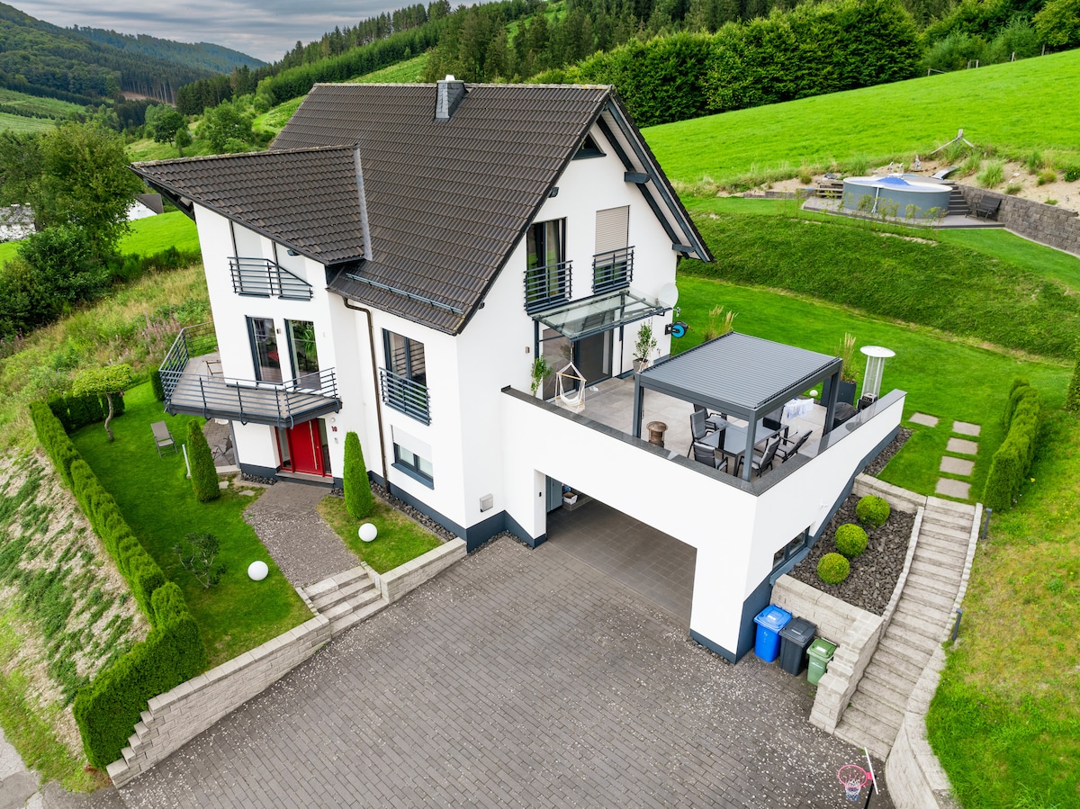Unser 2022 errichtetes, ökologisches Blockhaus liegt am Rand eines Eichenwäldchens auf einem 550m hohen Hochplateau namens Oesterberge, mitten im Naturpark Sauerland. Bei der Ausstattung haben wir besonderen Wert auf eine stilvolle und komfortable Einrichtung gelegt. Für Wanderer, Mountainbiker, aber auch für Familien mit Kindern wird sie so zu einem kleinen Paradies. Am Rand unseres Bauernhofes gelegen, erleben große und kleine Gäste bei uns Natur pur, Ruhe und spektakuläre Aussichten.