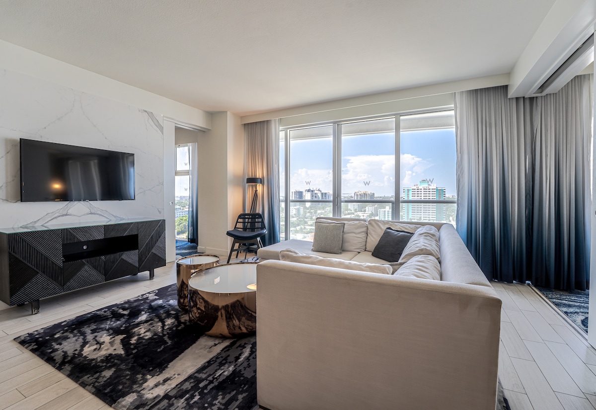 12th-floor luxury condo at the W Residence. Fully furnished 2-bed/2-bath with sweeping 180° city & Intracoastal views plus a beautiful side-ocean outlook from the balcony and living room. Modern kitchen with top appliances, in-unit washer/dryer. Resort-style amenities: beachside service, pools, jacuzzi, spa, fitness center & Living Room Bar. Dine at Steak 954, El Vez & Sobe Vegan just an elevator ride away. Steps to W Water Taxi, shops, nightlife & the beach.