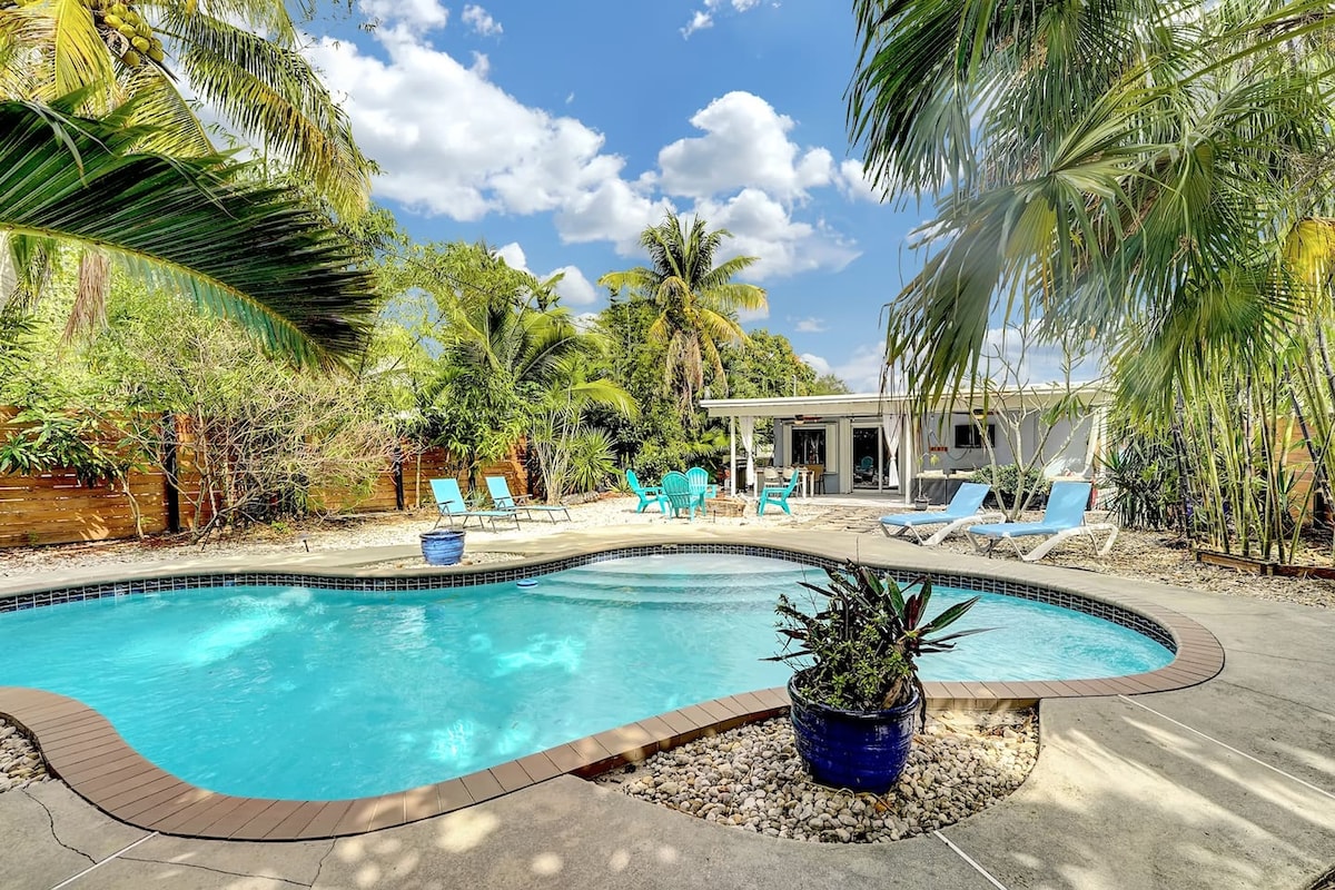 Beautifully furnished upscale home with a private, secluded backyard oasis. Enjoy the heated saltwater pool, hot tub, lush landscaping, and stylish indoor spaces with modern comforts. Fully equipped kitchen, gas grill, beach chairs, free WiFi, and cable TVs included. Perfect for relaxing, entertaining, or working remotely. Just a short walk to Wilton Drive and a quick drive to beaches and shopping.